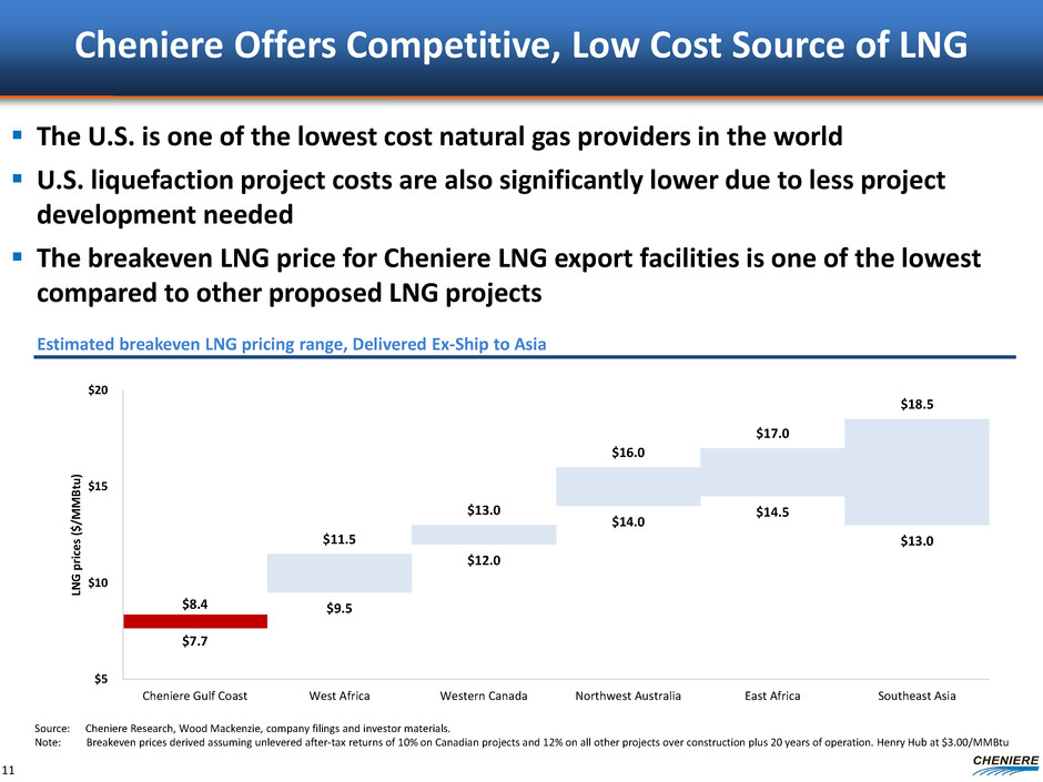 Cheniere’s LNG Export Projects Underpinned with Attractive SPA Features 10 Proven record of execution; proven technology SPAs feature parent guarantees & HH + fixed fee (no price reopeners) Cheniere LNG SPAs: LNG price tied to Henry Hub, destination flexibility, upstream gas procurement services, no lifting requirements