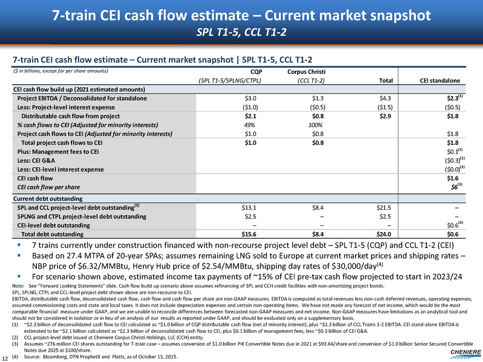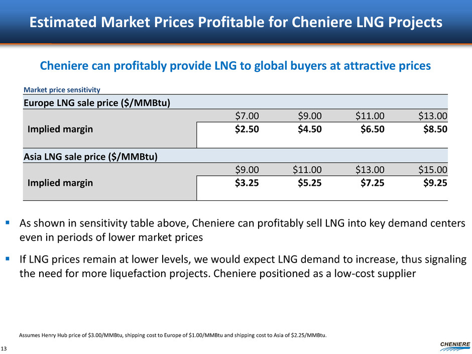 ($ in billions, except for per share amounts) Corpus Christi (CCL T1-2) Total CEI standalone CEI cash flow build up (2021 estimated amounts) Project EBITDA / Deconsolidated for standalone $3.0 $1.3 $4.3 $2.3 Less: Project-level interest expense ($1.0) ($0.5) ($1.5) ($0.5) Distributable cash flow from project $2.1 $0.8 $2.9 $1.8 % cash flows to CEI (Adjusted for minority interests) 49% 100% Project cash flows to CEI (Adjusted for minority interests) $1.0 $0.8 $1.8 Total project cash flows to CEI $1.0 $0.8 $1.8 Plus: Management fees to CEI $0.1 Less: CEI G&A ($0.3) Less: CEI-level interest expense ($0.0) CEI cash flow $1.6 CEI cash flow per share $6 Current debt outstanding SPL and CCL project-level debt outstanding(2) $13.1 $8.4 $21.5 – SPLNG and CTPL project-level debt outstanding $2.5 – $2.5 – CEI-level debt outstanding – – – $0.6 Total debt outstanding $15.6 $8.4 $24.0 $0.6 CQP (SPL T1-5/SPLNG/CTPL) (1) (3) (3) (3) (1) (1) 7-train CEI cash flow estimate – Current market snapshot SPL T1-5, CCL T1-2 7-train CEI cash flow estimate – Current market snapshot | SPL T1-5, CCL T1-2 7 trains currently under construction financed with non-recourse project level debt – SPL T1-5 (CQP) and CCL T1-2 (CEI) Based on 27.4 MTPA of 20-year SPAs; assumes remaining LNG sold to Europe at current market prices and shipping rates – NBP price of $6.32/MMBtu, Henry Hub price of $2.54/MMBtu, shipping day rates of $30,000/day(4) For scenario shown above, estimated income tax payments of ~15% of CEI pre-tax cash flow projected to start in 2023/24 12 Note: See “Forward Looking Statements” slide. Cash flow build up scenario above assumes refinancing of SPL and CCH credit facilities with non-amortizing project bonds. SPL, SPLNG, CTPL and CCL-level project debt shown above are non-recourse to CEI. EBITDA, distributable cash flow, deconsolidated cash flow, cash flow and cash flow per share are non-GAAP measures. EBITDA is computed as total revenues less non-cash deferred revenues, operating expenses, assumed commissioning costs and state and local taxes. It does not include depreciation expenses and certain non-operating items. We have not made any forecast of net income, which would be the most comparable financial measure under GAAP, and we are unable to reconcile differences between forecasted non-GAAP measures and net income. Non-GAAP measures have limitations as an analytical tool and should not be considered in isolation or in lieu of an analysis of our results as reported under GAAP, and should be evaluated only on a supplementary basis. (1) ~$2.3 billion of deconsolidated cash flow to CEI calculated as ~$1.0 billion of CQP distributable cash flow (net of minority interest), plus ~$1.3 billion of CCL Trains 1‐2 EBITDA. CEI stand‐alone EBITDA is estimated to be ~$2.1 billion calculated as ~$2.3 billion of deconsolidated cash flow to CEI, plus $0.1 billion of management fees, less ~$0.3 billion of CEI G&A. (2) CCL project-level debt issued at Cheniere Corpus Christi Holdings, LLC (CCH) entity. (3) Assumes ~276 million CEI shares outstanding for 7-train case – assumes conversion of $1.0 billion PIK Convertible Notes due in 2021 at $93.64/share and conversion of $1.0 billion Senior Secured Convertible Notes due 2025 at $100/share. (4) Source: Bloomberg, DTN ProphetX and Platts, as of October 13, 2015.