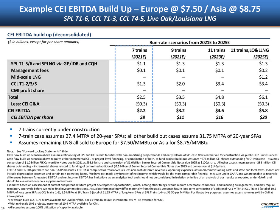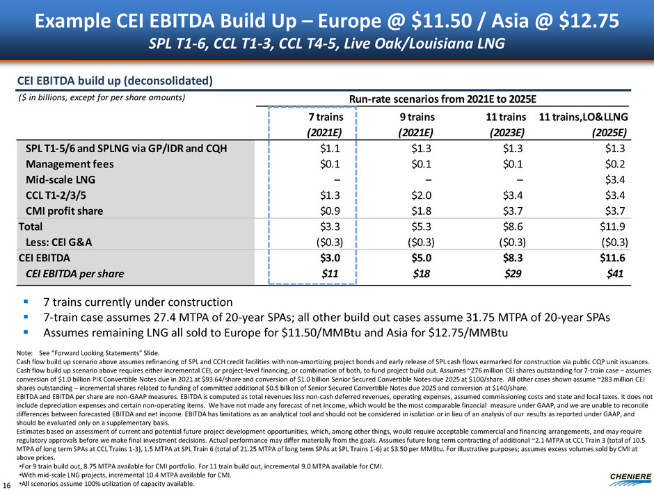 ($ in billions, except for per share amounts) Run-rate scenarios from 2021E to 2025E 7 trains (2021E) 9 trains (2021E) 11 trains (2023E) 11 trains,LO&LLNG (2025E) SPL T1-5/6 and SPLNG via GP/IDR and CQH $1.1 $1.3 $1.3 $1.3 Management fees $0.1 $0.1 $0.1 $0.2 Mid-scale LNG – – – $2.3 CCL T1-2/3/5 $1.3 $2.0 $3.4 $3.4 CMI profit share $0.4 $0.9 $1.9 $1.9 Total $2.9 $4.4 $6.7 $9.0 Less: CEI G&A ($0.3) ($0.3) ($0.3) ($0.3) CEI EBITDA $2.6 $4.1 $6.4 $8.7 CEI EBITDA per share $9 $14 $23 $31 Example CEI EBITDA Build Up – Europe @ $9.50 / Asia @ $10.75 SPL T1-6, CCL T1-3, CCL T4-5, Live Oak/Louisiana LNG 15 7 trains currently under construction 7-train case assumes 27.4 MTPA of 20-year SPAs; all other build out cases assume 31.75 MTPA of 20-year SPAs Assumes remaining LNG all sold to Europe for $9.50/MMBtu and Asia for $10.75/MMBtu CEI EBITDA build up (deconsolidated) Note: See “Forward Looking Statements” Slide. Cash flow build up scenario above assumes refinancing of SPL and CCH credit facilities with non-amortizing project bonds and early release of SPL cash flows earmarked for construction via public CQP unit issuances. Cash flow build up scenario above requires either incremental CEI, or project-level financing, or combination of both, to fund project build out. Assumes ~276 million CEI shares outstanding for 7-train case – assumes conversion of $1.0 billion PIK Convertible Notes due in 2021 at $93.64/share and conversion of $1.0 billion Senior Secured Convertible Notes due 2025 at $100/share. All other cases shown assume ~283 million CEI shares outstanding – incremental shares related to funding of committed additional $0.5 billion of Senior Secured Convertible Notes due 2025 and conversion at $140/share. EBITDA and EBITDA per share are non-GAAP measures. EBITDA is computed as total revenues less non-cash deferred revenues, operating expenses, assumed commissioning costs and state and local taxes. It does not include depreciation expenses and certain non-operating items. We have not made any forecast of net income, which would be the most comparable financial measure under GAAP, and we are unable to reconcile differences between forecasted EBITDA and net income. EBITDA has limitations as an analytical tool and should not be considered in isolation or in lieu of an analysis of our results as reported under GAAP, and should be evaluated only on a supplementary basis. Estimates based on assessment of current and potential future project development opportunities, which, among other things, would require acceptable commercial and financing arrangements, and may require regulatory approvals before we make final investment decisions. Actual performance may differ materially from the goals. Assumes future long term contracting of additional ~2.1 MTPA at CCL Train 3 (total of 10.5 MTPA of long term SPAs at CCL Trains 1-3), 1.5 MTPA at SPL Train 6 (total of 21.25 MTPA of long term SPAs at SPL Trains 1-6) at $3.50 per MMBtu. For illustrative purposes; assumes excess volumes sold by CMI at above prices. •For 9 train build out, 8.75 MTPA available for CMI portfolio. For 11 train build out, incremental 9.0 MTPA available for CMI. •With mid-scale LNG projects, incremental 10.4 MTPA available for CMI. •All scenarios assume 100% utilization of capacity available.