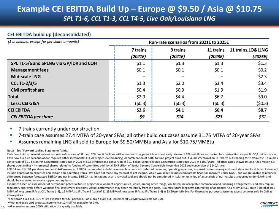 ($ in billions, except for per share amounts) Run-rate scenarios from 2021E to 2025E 7 trains (2021E) 9 trains (2021E) 11 trains (2023E) 11 trains,LO&LLNG (2025E) SPL T1-5/6 and SPLNG via GP/IDR and CQH $1.1 $1.3 $1.3 $1.3 Management fees $0.1 $0.1 $0.1 $0.2 Mid-scale LNG – – – $1.2 CCL T1-2/3/5 $1.3 $2.0 $3.4 $3.4 CMI profit share – – – – Total $2.5 $3.5 $4.8 $6.1 Less: CEI G&A ($0.3) ($0.3) ($0.3) ($0.3) CEI EBITDA $2.2 $3.2 $4.6 $5.8 CEI EBITDA per share $8 $11 $16 $20 Example CEI EBITDA Build Up – Europe @ $7.50 / Asia @ $8.75 SPL T1-6, CCL T1-3, CCL T4-5, Live Oak/Louisiana LNG CEI EBITDA build up (deconsolidated) 7 trains currently under construction 7-train case assumes 27.4 MTPA of 20-year SPAs; all other build out cases assume 31.75 MTPA of 20-year SPAs Assumes remaining LNG all sold to Europe for $7.50/MMBtu or Asia for $8.75/MMBtu 14 Note: See “Forward Looking Statements” Slide. Cash flow build up scenario above assumes refinancing of SPL and CCH credit facilities with non-amortizing project bonds and early release of SPL cash flows earmarked for construction via public CQP unit issuances. Cash flow build up scenario above requires either incremental CEI, or project-level financing, or combination of both, to fund project build out. Assumes ~276 million CEI shares outstanding for 7-train case – assumes conversion of $1.0 billion PIK Convertible Notes due in 2021 at $93.64/share and conversion of $1.0 billion Senior Secured Convertible Notes due 2025 at $100/share. All other cases shown assume ~283 million CEI shares outstanding – incremental shares related to funding of committed additional $0.5 billion of Senior Secured Convertible Notes due 2025 and conversion at $140/share. EBITDA and EBITDA per share are non-GAAP measures. EBITDA is computed as total revenues less non-cash deferred revenues, operating expenses, assumed commissioning costs and state and local taxes. It does not include depreciation expenses and certain non-operating items. We have not made any forecast of net income, which would be the most comparable financial measure under GAAP, and we are unable to reconcile differences between forecasted EBITDA and net income. EBITDA has limitations as an analytical tool and should not be considered in isolation or in lieu of an analysis of our results as reported under GAAP, and should be evaluated only on a supplementary basis. Estimates based on assessment of current and potential future project development opportunities, which, among other things, would require acceptable commercial and financing arrangements, and may require regulatory approvals before we make final investment decisions. Actual performance may differ materially from the goals. Assumes future long term contracting of additional ~2.1 MTPA at CCL Train 3 (total of 10.5 MTPA of long term SPAs at CCL Trains 1-3), 1.5 MTPA at SPL Train 6 (total of 21.25 MTPA of long term SPAs at SPL Trains 1-6) at $3.50 per MMBtu. For illustrative purposes; assumes excess volumes sold by CMI at above prices. •For 9 train build out, 8.75 MTPA available for CMI portfolio. For 11 train build out, incremental 9.0 MTPA available for CMI. •With mid-scale LNG projects, incremental 10.4 MTPA available for CMI. •All scenarios assume 100% utilization of capacity available.