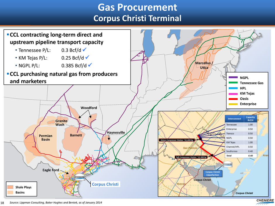 Gas Procurement Sabine Pass Terminal Securing feedstock for LNG production with balanced portfolio approach • To date, have entered into term gas supply contracts with producers under 1-7 year contracts • Supply contracts cover ~50% of the required daily load for Trains 1-4 at Sabine Pass • Pricing averages HH - $0.10 discount Redundant pipeline capacity helps ensure reliable gas deliverability • To date, we have secured firm pipeline transportation capacity of approximately ~4.2 Bcf/d of deliverability into Sabine Pass, or ~160% of the total load for Trains 1-4 Upstream pipeline capacity provides access to diverse supply sources • High degree of visibility into our ability to consistently deliver gas to Sabine Pass on a variable basis at Henry Hub flat 17