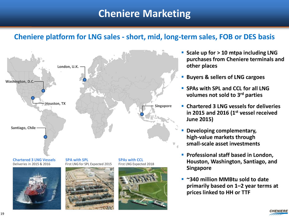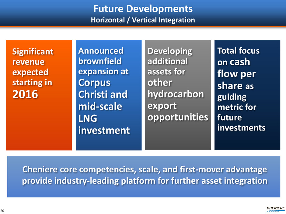Cheniere Marketing Scale up for > 10 mtpa including LNG purchases from Cheniere terminals and other places Buyers & sellers of LNG cargoes SPAs with SPL and CCL for all LNG volumes not sold to 3rd parties Chartered 3 LNG vessels for deliveries in 2015 and 2016 (1st vessel received June 2015) Developing complementary, high-value markets through small-scale asset investments Professional staff based in London, Houston, Washington, Santiago, and Singapore ~340 million MMBtu sold to date primarily based on 1–2 year terms at prices linked to HH or TTF Cheniere platform for LNG sales - short, mid, long-term sales, FOB or DES basis Singapore Houston, TX Santiago, Chile London, U.K. Chartered 3 LNG Vessels SPA with SPL SPAs with CCL Deliveries in 2015 & 2016 First LNG for SPL Expected 2015 First LNG Expected 2018 19 Washington, D.C.