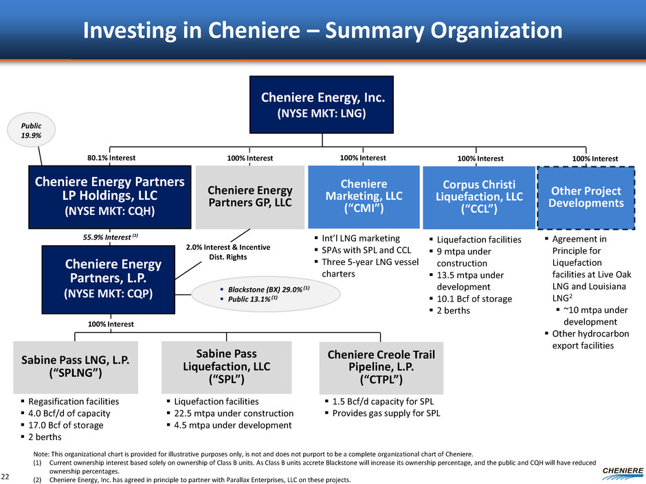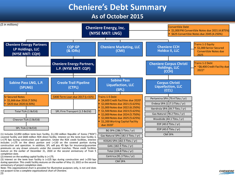 Investing in Cheniere – Summary Organization Cheniere Energy, Inc. (NYSE MKT: LNG) Sabine Pass LNG, L.P. (“SPLNG”) Sabine Pass Liquefaction, LLC (“SPL”) Cheniere Energy Partners, L.P. (NYSE MKT: CQP) Cheniere Creole Trail Pipeline, L.P. (“CTPL”) Corpus Christi Liquefaction, LLC (“CCL”) Cheniere Marketing, LLC (“CMI”) Cheniere Energy Partners GP, LLC 100% Interest 100% Interest 100% Interest 100% Interest Note: This organizational chart is provided for illustrative purposes only, is not and does not purport to be a complete organizational chart of Cheniere. (1) Current ownership interest based solely on ownership of Class B units. As Class B units accrete Blackstone will increase its ownership percentage, and the public and CQH will have reduced ownership percentages. (2) Cheniere Energy, Inc. has agreed in principle to partner with Parallax Enterprises, LLC on these projects. Liquefaction facilities 9 mtpa under construction 13.5 mtpa under development 10.1 Bcf of storage 2 berths Regasification facilities 4.0 Bcf/d of capacity 17.0 Bcf of storage 2 berths Liquefaction facilities 22.5 mtpa under construction 4.5 mtpa under development Cheniere Energy Partners LP Holdings, LLC (NYSE MKT: CQH) 1.5 Bcf/d capacity for SPL Provides gas supply for SPL 80.1% Interest 55.9% Interest (1) 2.0% Interest & Incentive Dist. Rights Int’l LNG marketing SPAs with SPL and CCL Three 5-year LNG vessel charters Blackstone (BX) 29.0% (1) Public 13.1% (1) Public 19.9% 22 Other Project Developments 100% Interest Agreement in Principle for Liquefaction facilities at Live Oak LNG and Louisiana LNG2 ~10 mtpa under development Other hydrocarbon export facilities