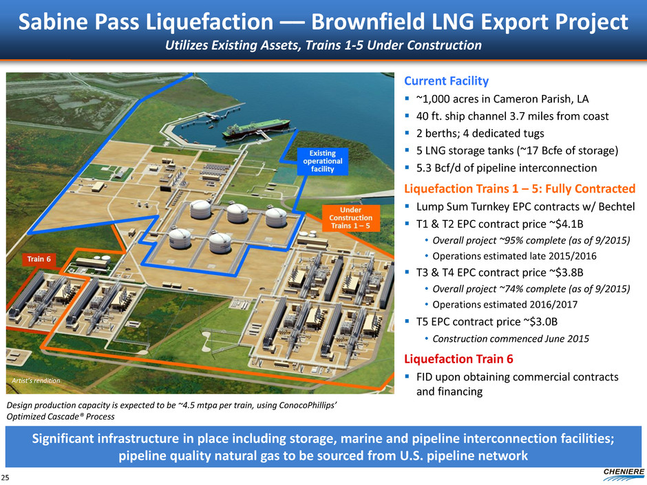 Cheniere’s Debt Summary As of October 2015 Cheniere Energy, Inc. (NYSE MKT: LNG) Cheniere Energy Partners, L.P. (NYSE MKT: CQP) Sabine Pass LNG, L.P. (SPLNG) Total TUA (1 Bcf/d) Chevron TUA (1 Bcf/d) SPL TUA (2 Bcf/d) Sr Secured Notes $1,666 due 2016 (7.50%) $420 due 2020 (6.50%) ($ in millions) Cheniere Marketing, LLC (CMI) Trains 1-5 Debt $4,600 Credit Facilities due 20201 $2,000 Notes due 2021 (5.625%) $1,000 Notes due 2022 (6.250%) $1,500 Notes due 2023 (5.625%) $2,000 Notes due 2024 (5.750%) $2,000 Notes due 2025 (5.625%) $1,200 Working Capital Facility due 20202 Sabine Pass Liquefaction, LLC (SPL) Creole Trail Pipeline (CTPL) $400 Term Loan due 2017 (L+325) CQP GP (& IDRs) (1) Includes $2,850 million term loan facility, $1,150 million Republic of Korea (“ROK”) covered facility and $600 million ROK direct facility. Interest on the term loan facility is L+175 bps during construction and operation. Under the ROK credit facilities, interest includes L+175 on the direct portion and L+130 on the covered portion during construction and operation. In addition, SPL will pay 45 bps for insurance/guarantee premiums on any drawn amounts under the covered tranches. These credit facilities mature on the earlier of December 31, 2020 or the second anniversary of Train 5 completion date. (2) Interest on the working capital facility is L+175. (3) Interest on the term loan facility is L+225 bps during construction and L+250 bps during operation. This credit facility matures on the earlier of May 13, 2022 or the second anniversary of project completion date . Note: This organizational chart is provided for illustrative purposes only, is not and does not purport to be a complete organizational chart of Cheniere. Cheniere Energy Partners LP Holdings, LLC (NYSE MKT: CQH) 23 Cheniere CCH Holdco II, LLC Convertible Debt $1,000 PIK Convertible Notes due 2021 (4.875%) $625 Convertible Notes due 2045 (4.250%) SPL Firm Transport (1.5 Bcf/d) BG SPA (286.5 Tbtu / yr) Gas Natural SPA (182.5 Tbtu / yr) KOGAS SPA (182.5 Tbtu / yr) GAIL (182.5 Tbtu / yr) Total (104.8 Tbtu / yr) Centrica (91.3 Tbtu / yr) CMI SPA Pertamina SPA (79.4 Tbtu / yr) Endesa SPA (117.3 Tbtu / yr) Iberdrola SPA (39.7 Tbtu / yr) Gas Natural (78.2 Tbtu / yr) Woodside (44.1 Tbtu / yr) EDF (40.0 Tbtu / yr) EDP (40.0 Tbtu / yr) CMI SPA Cheniere Corpus Christi Holdings, LLC (CCH) Trains 1-2 Equity $1,000 Senior Secured Convertible Notes due 2025 Trains 1-2 Debt ~$8,400 Credit Facility due 20223 Corpus Christi Liquefaction, LLC (CCL)