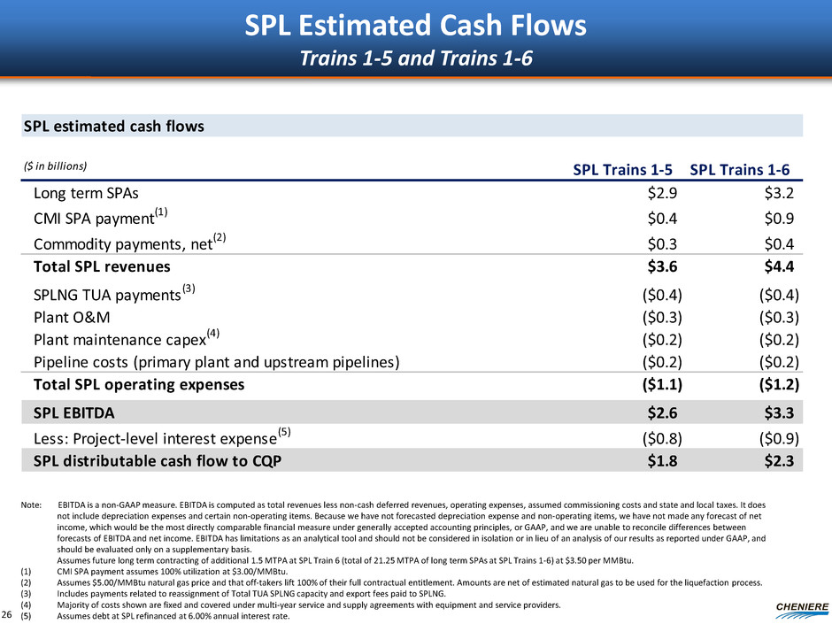 Sabine Pass Liquefaction –– Brownfield LNG Export Project Utilizes Existing Assets, Trains 1-5 Under Construction Significant infrastructure in place including storage, marine and pipeline interconnection facilities; pipeline quality natural gas to be sourced from U.S. pipeline network Design production capacity is expected to be ~4.5 mtpa per train, using ConocoPhillips’ Optimized Cascade® Process Current Facility ~1,000 acres in Cameron Parish, LA 40 ft. ship channel 3.7 miles from coast 2 berths; 4 dedicated tugs 5 LNG storage tanks (~17 Bcfe of storage) 5.3 Bcf/d of pipeline interconnection Liquefaction Trains 1 – 5: Fully Contracted Lump Sum Turnkey EPC contracts w/ Bechtel T1 & T2 EPC contract price ~$4.1B • Overall project ~95% complete (as of 9/2015) • Operations estimated late 2015/2016 T3 & T4 EPC contract price ~$3.8B • Overall project ~74% complete (as of 9/2015) • Operations estimated 2016/2017 T5 EPC contract price ~$3.0B • Construction commenced June 2015 Liquefaction Train 6 FID upon obtaining commercial contracts and financing Artist’s rendition 25