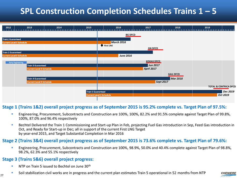 SPL Construction Completion Schedules Trains 1 – 5 Stage 1 (Trains 1&2) overall project progress as of September 2015 is 95.2% complete vs. Target Plan of 97.5%: Engineering, Procurement, Subcontracts and Construction are 100%, 100%, 82.2% and 91.5% complete against Target Plan of 99.8%, 100%, 87.0% and 96.4% respectively Bechtel Delivered the Train 1 Commissioning and Start-up Plan in Feb, projecting Fuel Gas introduction in Sep, Feed Gas introduction in Oct, and Ready for Start-up in Dec; all in support of the current First LNG Target by year-end 2015, and Target Substantial Completion in Mar 2016 Stage 2 (Trains 3&4) overall project progress as of September 2015 is 73.6% complete vs. Target Plan of 79.6%: Engineering, Procurement, Subcontracts and Construction are 100%, 98.9%, 50.0% and 40.4% complete against Target Plan of 98.8%, 98.2%, 62.3% and 55.1% respectively Stage 3 (Trains 5&6) overall project progress: NTP on Train 5 issued to Bechtel on June 30th Soil stabilization civil works are in progress and the current plan estimates Train 5 operational in 52 months from NTP BG DFCD GN DFCD KOGAS DFCD GAIL DFCD First LNG March 2016 April 2017 Jun 2017 Mar 2018 June 2016 Sept 2017 27 Dec 2019 Oct 2019 Early Engineering TOTAL & CENTRICA DFCD