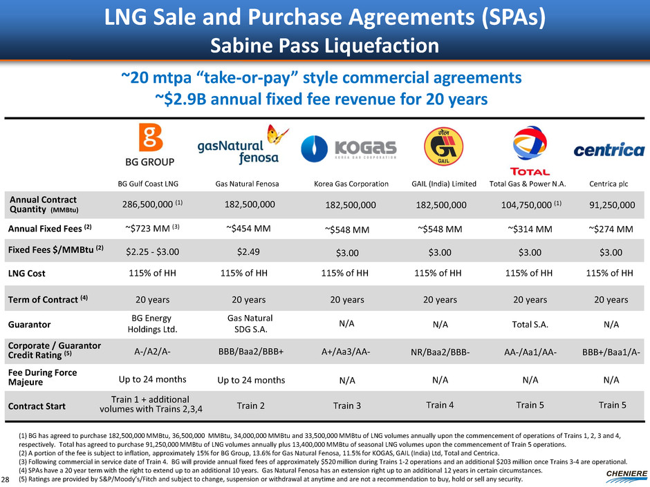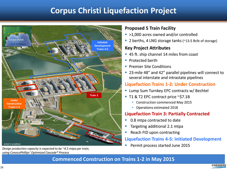 LNG Sale and Purchase Agreements (SPAs) Sabine Pass Liquefaction (1) BG has agreed to purchase 182,500,000 MMBtu, 36,500,000 MMBtu, 34,000,000 MMBtu and 33,500,000 MMBtu of LNG volumes annually upon the commencement of operations of Trains 1, 2, 3 and 4, respectively. Total has agreed to purchase 91,250,000 MMBtu of LNG volumes annually plus 13,400,000 MMBtu of seasonal LNG volumes upon the commencement of Train 5 operations. (2) A portion of the fee is subject to inflation, approximately 15% for BG Group, 13.6% for Gas Natural Fenosa, 11.5% for KOGAS, GAIL (India) Ltd, Total and Centrica. (3) Following commercial in service date of Train 4. BG will provide annual fixed fees of approximately $520 million during Trains 1-2 operations and an additional $203 million once Trains 3-4 are operational. (4) SPAs have a 20 year term with the right to extend up to an additional 10 years. Gas Natural Fenosa has an extension right up to an additional 12 years in certain circumstances. (5) Ratings are provided by S&P/Moody’s/Fitch and subject to change, suspension or withdrawal at anytime and are not a recommendation to buy, hold or sell any security. BG Gulf Coast LNG Gas Natural Fenosa Annual Contract Quantity (MMBtu) 286,500,000 (1) Fixed Fees $/MMBtu (2) Annual Fixed Fees (2) ~$723 MM (3) ~$454 MM Term of Contract (4) Guarantor 20 years BG Energy Holdings Ltd. Gas Natural SDG S.A. Corporate / Guarantor Credit Rating (5) A-/A2/A- BBB/Baa2/BBB+ Fee During Force Majeure Up to 24 months Up to 24 months 20 years GAIL (India) Limited ~$548 MM 20 years NR/Baa2/BBB- N/A N/A Contract Start Train 1 + additional volumes with Trains 2,3,4 Train 2 Train 4 $2.25 - $3.00 $2.49 $3.00 182,500,000 182,500,000 20 years N/A N/A A+/Aa3/AA- Train 3 $3.00 ~$548 MM Korea Gas Corporation 182,500,000 ~$314 MM 20 years AA-/Aa1/AA- N/A Total S.A. Train 5 $3.00 104,750,000 (1) Total Gas & Power N.A. ~$274 MM 20 years BBB+/Baa1/A- N/A N/A $3.00 91,250,000 Centrica plc Train 5 LNG Cost 115% of HH 115% of HH 115% of HH 115% of HH 115% of HH 115% of HH ~20 mtpa “take-or-pay” style commercial agreements ~$2.9B annual fixed fee revenue for 20 years 28