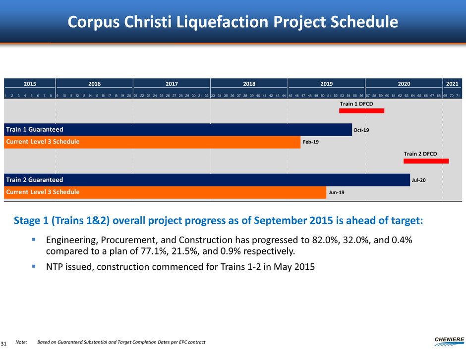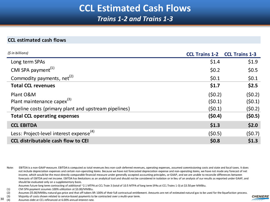 CCL estimated cash flows ($ in billions) CCL Trains 1-2 CCL Trains 1-3 Long term SPAs $1.4 $1.9 CMI SPA payment(1) $0.2 $0.5 Commodity payments, net(2) $0.1 $0.1 Total CCL revenues $1.7 $2.5 Plant O&M ($0.2) ($0.2) Plant maintenance capex (3) ($0.1) ($0.1) Pipeline costs (primary plant and upstream pipelines) ($0.1) ($0.2) Total CCL operating expenses ($0.4) ($0.5) CCL EBITDA $1.3 $2.0 Less: Project-level interest expense(4) ($0.5) ($0.7) CCL distributable cash flow to CEI $0.8 $1.3 CCL Estimated Cash Flows Trains 1-2 and Trains 1-3 30 Note: EBITDA is a non-GAAP measure. EBITDA is computed as total revenues less non-cash deferred revenues, operating expenses, assumed commissioning costs and state and local taxes. It does not include depreciation expenses and certain non-operating items. Because we have not forecasted depreciation expense and non-operating items, we have not made any forecast of net income, which would be the most directly comparable financial measure under generally accepted accounting principles, or GAAP, and we are unable to reconcile differences between forecasts of EBITDA and net income. EBITDA has limitations as an analytical tool and should not be considered in isolation or in lieu of an analysis of our results as reported under GAAP, and should be evaluated only on a supplementary basis. Assumes future long term contracting of additional ~2.1 MTPA at CCL Train 3 (total of 10.5 MTPA of long term SPAs at CCL Trains 1-3) at $3.50 per MMBtu. (1) CMI SPA payment assumes 100% utilization at $3.00/MMBtu. (2) Assumes $5.00/MMBtu natural gas price and that off-takers lift 100% of their full contractual entitlement. Amounts are net of estimated natural gas to be used for the liquefaction process. (3) Majority of costs shown related to service-based payments to be contracted over a multi-year term. (4) Assumes debt at CCL refinanced at 6.00% annual interest rate.