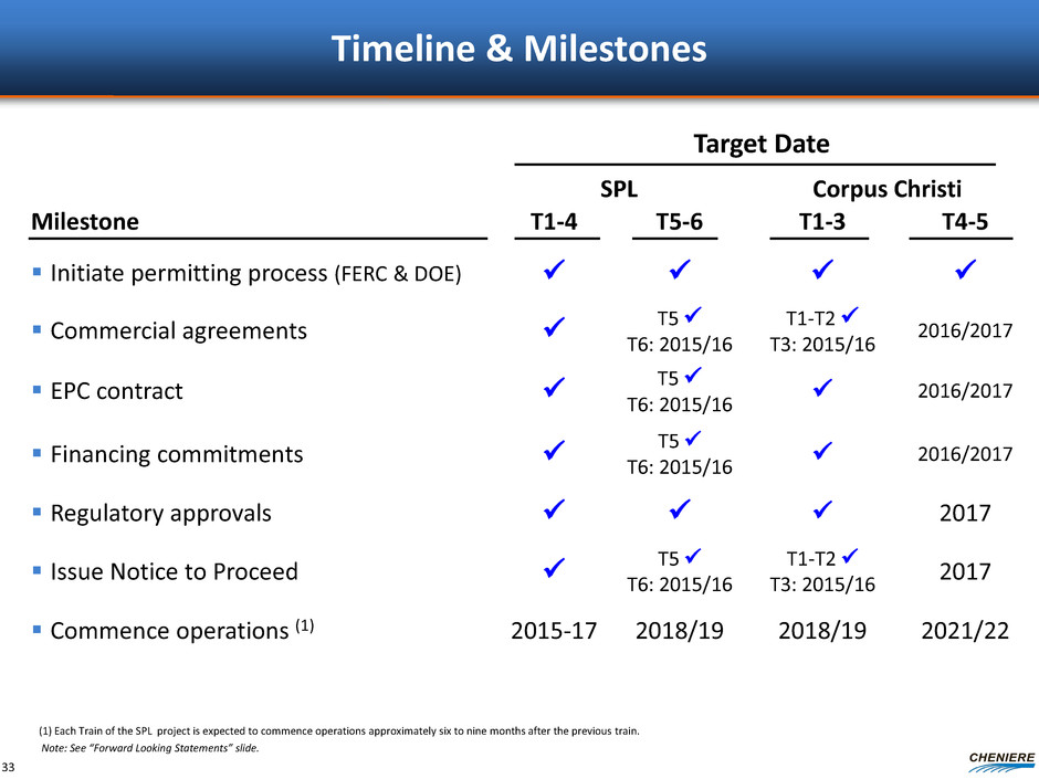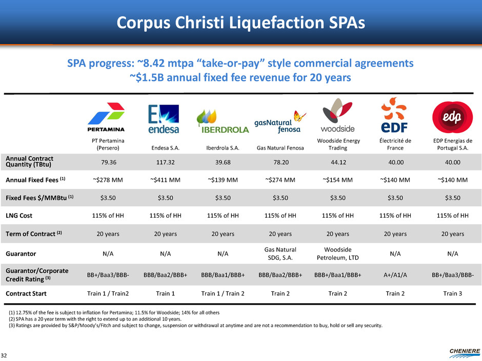 PT Pertamina (Persero) Endesa S.A. Iberdrola S.A. Gas Natural Fenosa Woodside Energy Trading Électricité de France EDP Energias de Portugal S.A. Annual Contract Quantity (TBtu) 79.36 117.32 39.68 78.20 44.12 40.00 40.00 Annual Fixed Fees (1) ~$278 MM ~$411 MM ~$139 MM ~$274 MM ~$154 MM ~$140 MM ~$140 MM Fixed Fees $/MMBtu (1) $3.50 $3.50 $3.50 $3.50 $3.50 $3.50 $3.50 LNG Cost 115% of HH 115% of HH 115% of HH 115% of HH 115% of HH 115% of HH 115% of HH Term of Contract (2) 20 years 20 years 20 years 20 years 20 years 20 years 20 years Guarantor N/A N/A N/A Gas Natural SDG, S.A. Woodside Petroleum, LTD N/A N/A Guarantor/Corporate Credit Rating (3) BB+/Baa3/BBB- BBB/Baa2/BBB+ BBB/Baa1/BBB+ BBB/Baa2/BBB+ BBB+/Baa1/BBB+ A+/A1/A BB+/Baa3/BBB- Contract Start Train 1 / Train2 Train 1 Train 1 / Train 2 Train 2 Train 2 Train 2 Train 3 Corpus Christi Liquefaction SPAs SPA progress: ~8.42 mtpa “take-or-pay” style commercial agreements ~$1.5B annual fixed fee revenue for 20 years (1) 12.75% of the fee is subject to inflation for Pertamina; 11.5% for Woodside; 14% for all others (2) SPA has a 20 year term with the right to extend up to an additional 10 years. (3) Ratings are provided by S&P/Moody’s/Fitch and subject to change, suspension or withdrawal at anytime and are not a recommendation to buy, hold or sell any security. 32