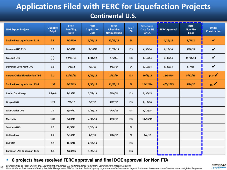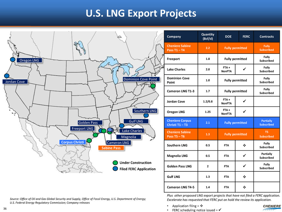 Applications Filed with FERC for Liquefaction Projects Continental U.S. LNG Export Projects Quantity Bcf/d FERC Pre-filing Date FERC Application Date FERC Scheduling Notice Issued EIS / EA Scheduled Date for EIS or EA FERC Approval DOE Non FTA Final Under Construction Sabine Pass Liquefaction T1-4 2.8 7/26/10 1/31/11 12/16/11 EA 4/16/12 8/7/12 Cameron LNG T1-3 1.7 4/30/12 12/10/12 11/21/13 EIS 4/30/14 6/19/14 9/10/14 Freeport LNG 1.4 0.4 12/23/10 8/31/12 1/6/14 EIS 6/16/14 7/30/14 11/14/14 Dominion Cove Point LNG 1.0 6/1/12 4/1/13 3/12/14 EA 5/15/14 9/29/14 5/7/15 Corpus Christi Liquefaction T1-3 2.1 12/13/11 8/31/12 2/12/14 EIS 10/8/14 12/30/14 5/12/15 T1-2: Sabine Pass Liquefaction T5-6 1.38 2/27/13 9/30/13 11/03/14 EA 12/12/14 4/6/2015 6/26/15 T5: Jordan Cove Energy 1.2/0.8 2/29/12 5/22/13 7/16/14 EIS 9/30/15 Oregon LNG 1.25 7/3/12 6/7/13 4/17/15 EIS 2/12/16 Lake Charles LNG 2.0 3/30/12 3/25/14 1/26/15 EIS 8/14/15 Magnolia 1.08 3/20/13 4/30/14 4/30/15 EIS 11/16/15 Southern LNG 0.5 12/5/12 3/10/14 EA Golden Pass 2.6 5/16/13 7/7/14 6/26/15 EA 3/4/16 Gulf LNG 1.3 12/6/12 6/19/15 EIS Cameron LNG Expansion T4-5 1.4 2/24/15 9/28/15 EIS Note: National Environmental Policy Act (NEPA) empowers FERC as the lead Federal agency to prepare an Environmental Impact Statement in cooperation with other state and federal agencies Source: Office of Fossil Energy, U.S. Department of Energy; U.S. Federal Energy Regulatory Commission; Company releases 6 projects have received FERC approval and final DOE approval for Non FTA 35