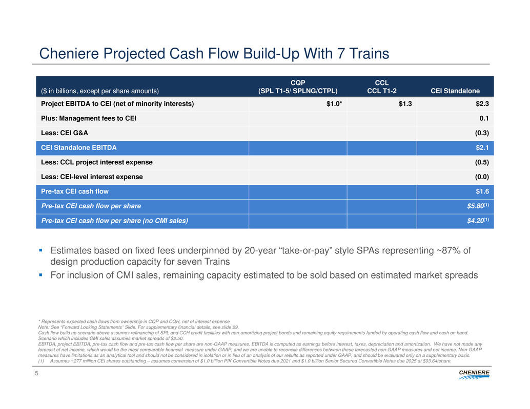 Estimated EBITDA forecast for CEI standalone based on addition of Train 8 (Corpus Christi Train 3) and Train 9 (Sabine Pass Train 6) 14 * Represents expected cash flows from ownership in CQP and CQH, net of interest expense. Note: See “Forward Looking Statements” Slide. For supplementary financial details, see slide 29 Cash flow build up scenario above assumes refinancing of SPL and CCH credit facilities with non-amortizing project bonds and remaining equity requirements funded by operating cash flow and cash on hand. Scenario assumes full utilization of capacity available and excess volumes sold by CMI at market spreads of $2.50. 8 train case assumes additional ~2.1MTPA of 20-year SPAs at $3.50/mmbtu on CCL Train 3; 9 train case assumes 1.5MTPA of 20-year SPAs at $3.50/mmbtu on SPL Train 6. EBITDA is a non-GAAP measure. EBITDA is computed as earnings before interest, taxes, depreciation and amortization. We have not made any forecast of net income, which would be the most comparable financial measure under GAAP, and we are unable to reconcile differences between forecasted EBITDA and net income. Non-GAAP measures have limitations as an analytical tool and should not be considered in isolation or in lieu of an analysis of our results as reported under GAAP, and should be evaluated only on a supplementary basis. Run-rate scenarios 7 trains 8 trains 9 trains SPL T1-5/6 and SPLNG/CTPL via GP/IDR and CQH $1.0* $1.0* $1.3* Management fees $0.1 $0.1 $0.1 CCL T1-2/3 $1.3 $2.0 $2.0 CMI profit share - - - Total $2.4 $3.1 $3.3 Less CEI G&A ($0.3) ($0.3) ($0.3) CEI Standalone EBITDA $2.1 $2.8 $3.0 Illustrative cash flow build-up ($ in billions) CEI Standalone EBITDA Forecast with Additional Trains