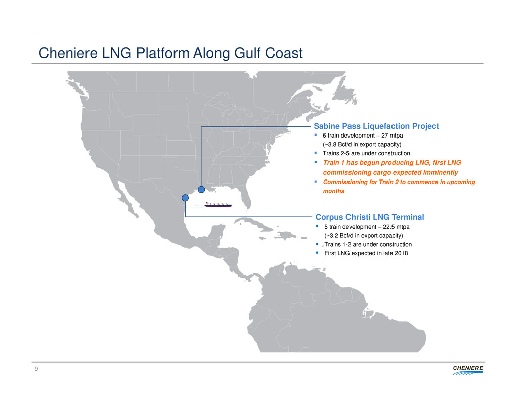 Cheniere’s Key Businesses LNG Platform Developing/constructing LNG terminals located along Gulf of Mexico 7 Trains (31.5 mtpa) under construction; 2 Trains (9.0 mtpa) permitted, ready for commercialization Scalable platform SPL T1-5 and CCL T1-2 underpinned by long-term contracts with investment-grade counterparties featuring parent as counterparty or guarantor – ~87% of LNG design production capacity sold under SPAs Gas Procurement Providing feedstock to SPL and CCL for LNG production Securing redundant pipeline capacity ensures reliable gas deliverability Securing additional pipeline capacity upstream provides access to diverse supply sources Cheniere Marketing ~9 mtpa of LNG volumes expected to be available from SPL T1-6 and CCL T1-3 LNG sales provided to customers on a more customized basis, short, mid, and long-term LNG offered DAT or FOB, tied to indices such as Henry Hub, TTF and NBP LNG vessels chartered for DAT sales 8 Unmatched scale and first-mover advantage provide industry-leading platform for further asset integration