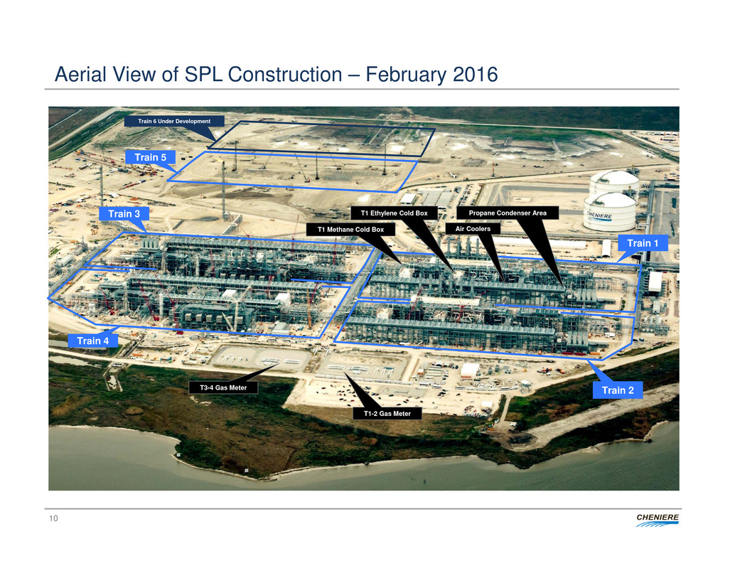 Cheniere LNG Platform Along Gulf Coast 9 Sabine Pass Liquefaction Project 6 train development – 27 mtpa (~3.8 Bcf/d in export capacity) Trains 2-5 are under construction Train 1 has begun producing LNG, first LNG commissioning cargo expected imminently Commissioning for Train 2 to commence in upcoming months Corpus Christi LNG Terminal 5 train development – 22.5 mtpa (~3.2 Bcf/d in export capacity) Trains 1-2 are under construction First LNG expected in late 2018