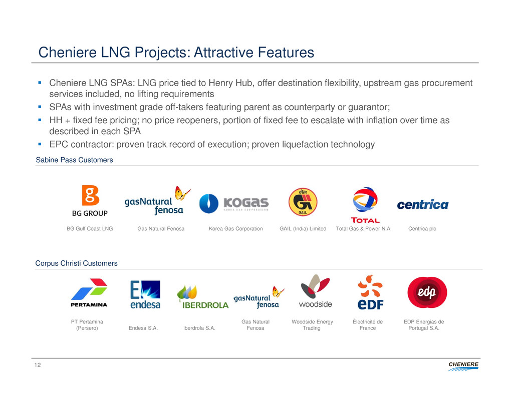 Cheniere LNG Projects: Attractive Features Cheniere LNG SPAs: LNG price tied to Henry Hub, offer destination flexibility, upstream gas procurement services included, no lifting requirements SPAs with investment grade off-takers featuring parent as counterparty or guarantor; HH + fixed fee pricing; no price reopeners, portion of fixed fee to escalate with inflation over time as described in each SPA EPC contractor: proven track record of execution; proven liquefaction technology 12 PT Pertamina (Persero) Endesa S.A. Iberdrola S.A. Gas Natural Fenosa Woodside Energy Trading Électricité de France EDP Energias de Portugal S.A. BG Gulf Coast LNG Gas Natural Fenosa GAIL (India) LimitedKorea Gas Corporation Total Gas & Power N.A. Centrica plc Corpus Christi Customers Sabine Pass Customers