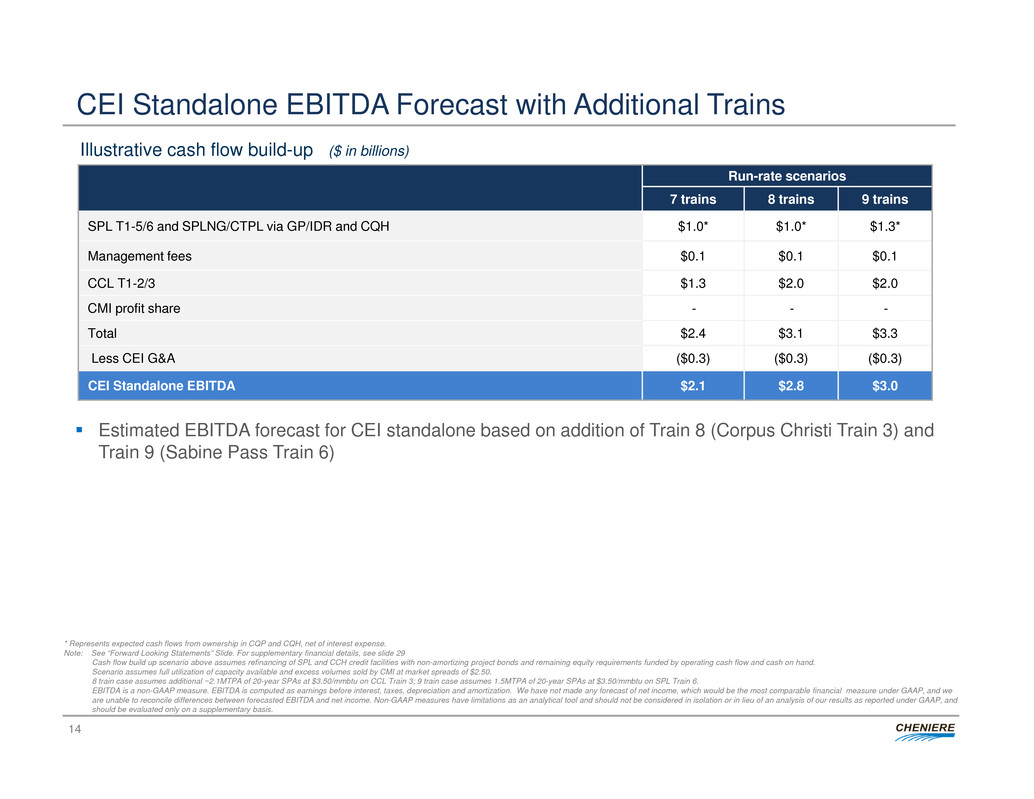 Forecast Cheniere LNG Portfolio Summary 13 (1) Includes ~0.7 mtpa contract with CMI for Central El Campesino in Chile. Project FID pending. Trains under construction underpinned by long term SPAs Continuing commercialization of additional trains; FID for SPL Train 6 and CCL Train 3 expected upon, among other things, obtaining sufficient long term SPAs to underpin financing required and obtaining financing (permits already obtained) (in MTPA) SPL Trains 1-5 CCL Trains 1-2 Total Under Construction SPL Train 6 CCL Train 3 Total Portfolio Design Capacity 22.5 9.0 31.5 4.5 4.5 40.5 Under Construction 22.5 9.0 31.5 - - 31.5 LT SPAs sold to date (% sold) 19.8 (~88% sold) 7.7 (~86% sold) 27.4 (~87% sold) - 1.5 (1) 28.8 Excess Volumes/CMI 2.7 1.3 4.1 TBD TBD TBD
