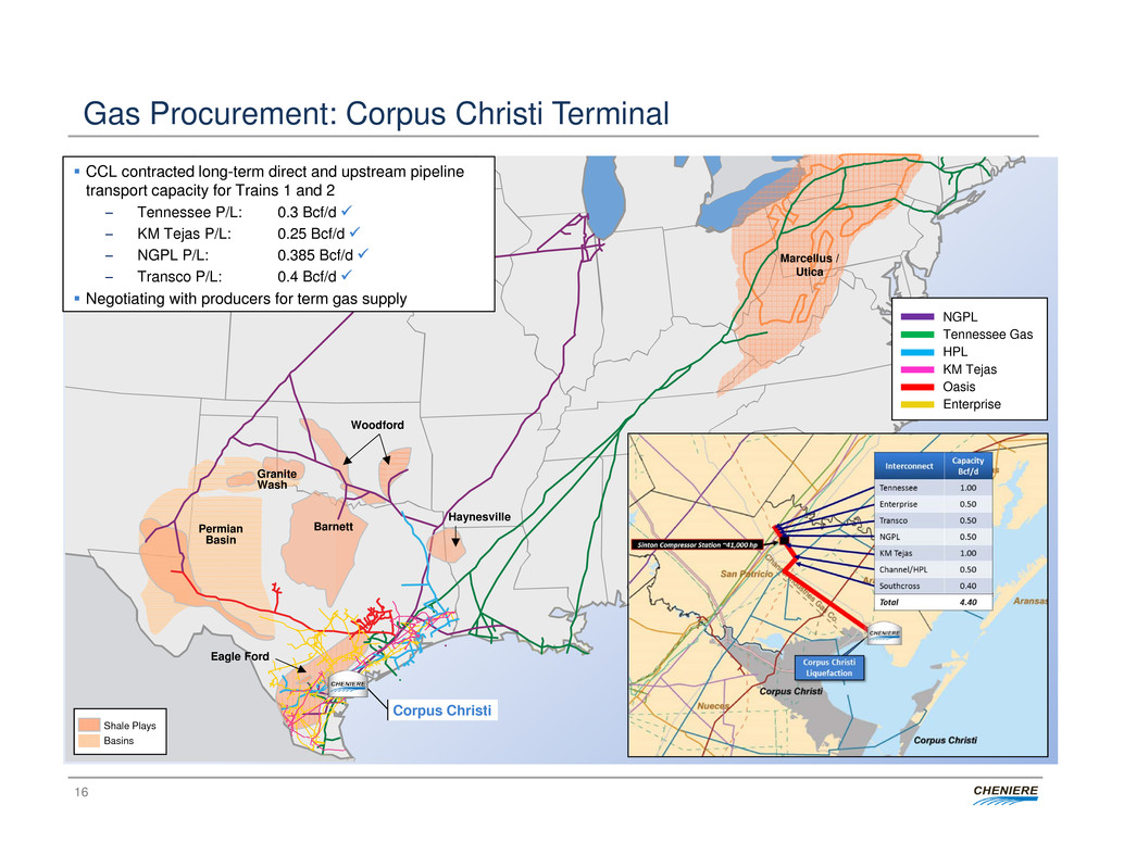 Gas Procurement: Sabine Pass Terminal Securing feedstock for LNG production with balanced portfolio approach • To date, have entered into term gas supply contracts with producers under 1-7 year contracts aggregating approximately 2 Tcf. • Supply contracts cover ~50% of the required daily load for Trains 1-4 at Sabine Pass • Pricing averages HH - $0.10 discount Redundant pipeline capacity helps ensure reliable gas deliverability • Secured firm pipeline transportation capacity of approximately ~4.2 Bcf/d of deliverability into Sabine Pass, or ~130% of the total load for Trains 1-5 Upstream pipeline capacity provides access to diverse supply sources • High degree of visibility into our ability to consistently deliver gas to Sabine Pass on a variable basis at Henry Hub flat 15