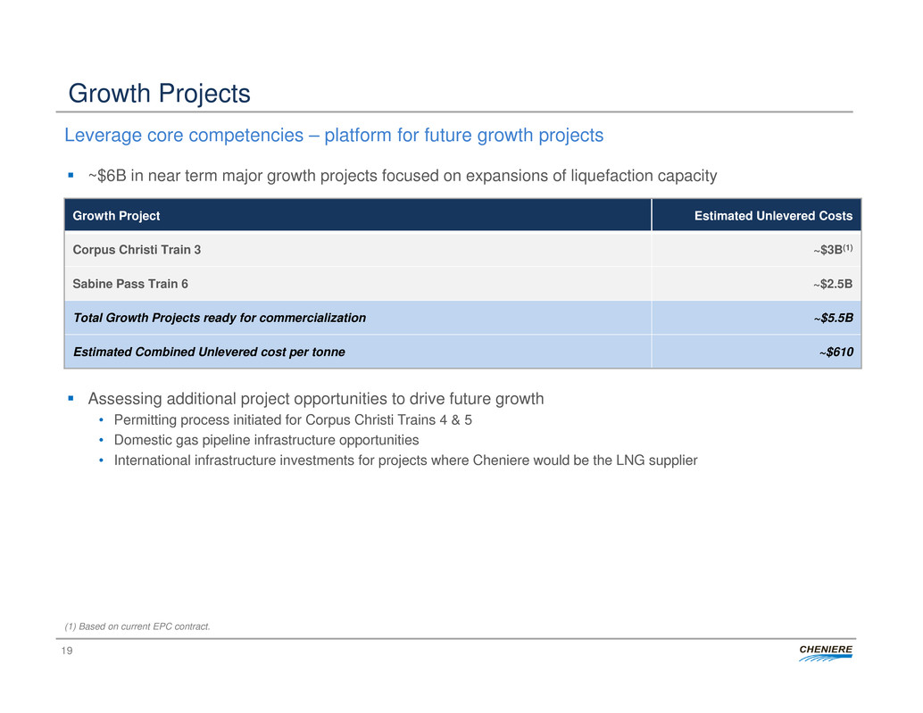 Cheniere Marketing – Significant LNG Sales to Date Marketing Deals Entered Into Prior to 2015 EDF ENGIE El Campesino(1) (pending FID) Contracted Quantity ~150 MM MMBtus (42 cargoes) ~150 MM MMBtus (42 cargoes) ~222 MM MMBtus (12 cargoes per year) 32.3 MM MMBtus/year (~9 cargoes per year) Term of Contract 2016 - 2018 2016 - 2018 5 years(2018 – 2023) 20 years (starting in 2019) LNG Cost HH + fixed fee Price linked to TTF Price linked to European indices HH + fixed fee Delivery DAT / FOB DAT DAT DAT 18 CMI expected to have access to ~4.1 mtpa of LNG volumes once 7 trains are operational, ~213 Tbtu/year Significant portion of projected LNG available through 2018 already sold under deals transacted in 2014 and 2015 The El Campesino(1) SPA would represent ~17% of CMI’s projected LNG available from 7 Trains for 20 years; • SPA is pending FID of El Campesino power plant • HH + fixed fee pricing structure would provide visibility into profitability over 20-year contract term Additional opportunities • CMI evaluating opportunities on integrated gas-fired infrastructure projects (similar transactions to El Campesino) • Willing to invest capital to help develop new markets for LNG where Cheniere would be the LNG supplier (1) Project FID pending