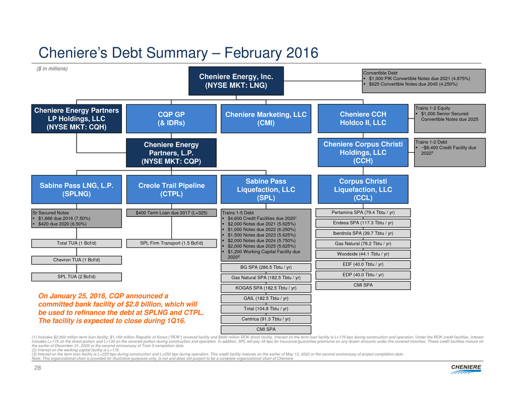 Cheniere’s Debt Summary – February 2016 28 Cheniere Energy, Inc. (NYSE MKT: LNG) Cheniere Energy Partners, L.P. (NYSE MKT: CQP) Sabine Pass LNG, L.P. (SPLNG) Total TUA (1 Bcf/d) Chevron TUA (1 Bcf/d) SPL TUA (2 Bcf/d) Sr Secured Notes $1,666 due 2016 (7.50%) $420 due 2020 (6.50%) ($ in millions) Cheniere Marketing, LLC (CMI) Trains 1-5 Debt $4,600 Credit Facilities due 20201 $2,000 Notes due 2021 (5.625%) $1,000 Notes due 2022 (6.250%) $1,500 Notes due 2023 (5.625%) $2,000 Notes due 2024 (5.750%) $2,000 Notes due 2025 (5.625%) $1,200 Working Capital Facility due 20202 Sabine Pass Liquefaction, LLC (SPL) Creole Trail Pipeline (CTPL) $400 Term Loan due 2017 (L+325) CQP GP (& IDRs) (1) Includes $2,850 million term loan facility, $1,150 million Republic of Korea (“ROK”) covered facility and $600 million ROK direct facility. Interest on the term loan facility is L+175 bps during construction and operation. Under the ROK credit facilities, interest includes L+175 on the direct portion and L+130 on the covered portion during construction and operation. In addition, SPL will pay 45 bps for insurance/guarantee premiums on any drawn amounts under the covered tranches. These credit facilities mature on the earlier of December 31, 2020 or the second anniversary of Train 5 completion date. (2) Interest on the working capital facility is L+175. (3) Interest on the term loan facility is L+225 bps during construction and L+250 bps during operation. This credit facility matures on the earlier of May 13, 2022 or the second anniversary of project completion date . Note: This organizational chart is provided for illustrative purposes only, is not and does not purport to be a complete organizational chart of Cheniere. Cheniere Energy Partners LP Holdings, LLC (NYSE MKT: CQH) Cheniere CCH Holdco II, LLC Convertible Debt $1,000 PIK Convertible Notes due 2021 (4.875%) $625 Convertible Notes due 2045 (4.250%) SPL Firm Transport (1.5 Bcf/d) BG SPA (286.5 Tbtu / yr) Gas Natural SPA (182.5 Tbtu / yr) KOGAS SPA (182.5 Tbtu / yr) GAIL (182.5 Tbtu / yr) Total (104.8 Tbtu / yr) Centrica (91.3 Tbtu / yr) CMI SPA Pertamina SPA (79.4 Tbtu / yr) Endesa SPA (117.3 Tbtu / yr) Iberdrola SPA (39.7 Tbtu / yr) Gas Natural (78.2 Tbtu / yr) Woodside (44.1 Tbtu / yr) EDF (40.0 Tbtu / yr) EDP (40.0 Tbtu / yr) CMI SPA Cheniere Corpus Christi Holdings, LLC (CCH) Trains 1-2 Equity $1,000 Senior Secured Convertible Notes due 2025 Trains 1-2 Debt ~$8,400 Credit Facility due 20223 Corpus Christi Liquefaction, LLC (CCL) On January 25, 2016, CQP announced a committed bank facility of $2.8 billion, which will be used to refinance the debt at SPLNG and CTPL. The facility is expected to close during 1Q16.