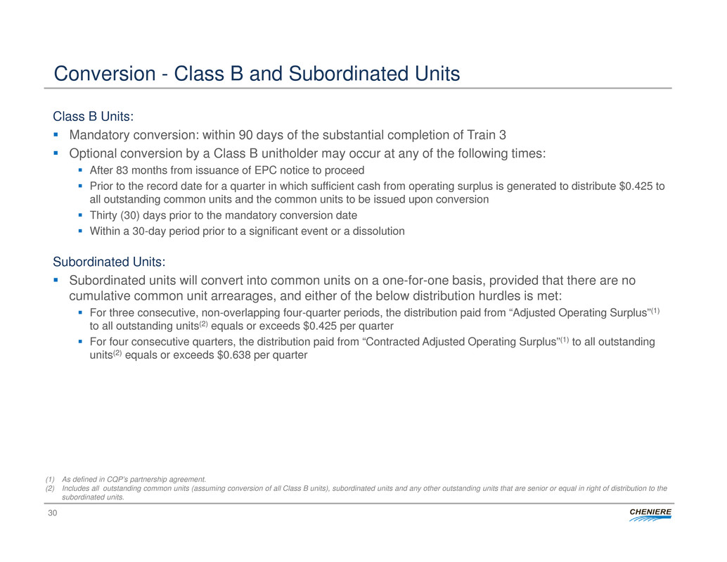 Conversion - Class B and Subordinated Units Class B Units: Mandatory conversion: within 90 days of the substantial completion of Train 3 Optional conversion by a Class B unitholder may occur at any of the following times: After 83 months from issuance of EPC notice to proceed Prior to the record date for a quarter in which sufficient cash from operating surplus is generated to distribute $0.425 to all outstanding common units and the common units to be issued upon conversion Thirty (30) days prior to the mandatory conversion date Within a 30-day period prior to a significant event or a dissolution Subordinated Units: Subordinated units will convert into common units on a one-for-one basis, provided that there are no cumulative common unit arrearages, and either of the below distribution hurdles is met: For three consecutive, non-overlapping four-quarter periods, the distribution paid from “Adjusted Operating Surplus”(1) to all outstanding units(2) equals or exceeds $0.425 per quarter For four consecutive quarters, the distribution paid from “Contracted Adjusted Operating Surplus”(1) to all outstanding units(2) equals or exceeds $0.638 per quarter 30 (1) As defined in CQP’s partnership agreement. (2) Includes all outstanding common units (assuming conversion of all Class B units), subordinated units and any other outstanding units that are senior or equal in right of distribution to the subordinated units.