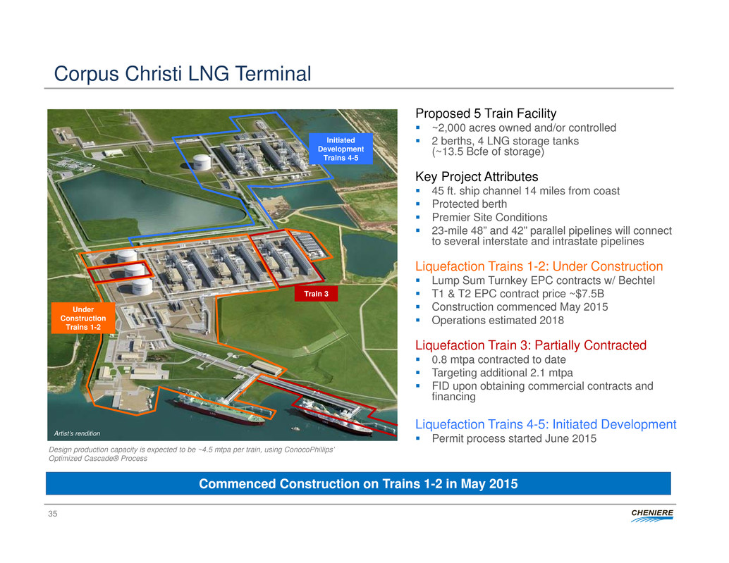 Sabine Pass Liquefaction SPAs 34 BG Gulf Coast LNG Gas Natural Fenosa Korea Gas Corporation GAIL (India) Limited Total Gas & Power N.A. Centrica plc Annual Contract Quantity (Tbtu) 286.50 (1) 182.50 182.50 182.50 104.75 (1) 91.25 Annual Fixed Fees (2) ~$723 MM (3) ~$454 MM ~$548 MM ~$548 MM ~$314 MM ~$274 MM Fixed Fees $/MMBtu(2) $2.25 - $3.00 $2.49 $3.00 $3.00 $3.00 $3.00 LNG Cost 115% of HH 115% of HH 115% of HH 115% of HH 115% of HH 115% of HH Term of Contract (4) 20 years 20 years 20 years 20 years 20 years 20 years Guarantor BG Energy Holdings Ltd. Gas Natural SDG S.A N/A N/A Total S.A. N/A Guarantor/Corporate Credit Rating (5) A+/A2/A+ BBB/Baa2/BBB+ A+/Aa2/AA- NR/Baa2/BBB- A+/Aa1/AA- BBB+/Baa1/A- Fee During Force Majeure Up to 24 months Up to 24 months N/A N/A N/A N/A Contract Start Train 1 + additional volumes with Trains 2,3,4 Train 2 Train 3 Train 4 Train 5 Train 5 (1) BG has agreed to purchase 182,500,000 MMBtu, 36,500,000 MMBtu, 34,000,000 MMBtu and 33,500,000 MMBtu of LNG volumes annually upon the commencement of operations of Trains 1, 2, 3 and 4, respectively. Total has agreed to purchase 91,250,000 MMBtu of LNG volumes annually plus 13,400,000 MMBtu of seasonal LNG volumes upon the commencement of Train 5 operations. (2) A portion of the fee is subject to inflation, approximately 15% for BG Group, 13.6% for Gas Natural Fenosa, 15% for KOGAS and GAIL (India) Ltd and 11.5% for Total and Centrica. (3) Following commercial in service date of Train 4. BG will provide annual fixed fees of approximately $520 million during Trains 1-2 operations and an additional $203 million once Trains 3-4 are operational. (4) SPAs have a 20 year term with the right to extend up to an additional 10 years. Gas Natural Fenosa has an extension right up to an additional 12 years in certain circumstances. (5) Ratings are provided by S&P/Moody’s/Fitch and subject to change, suspension or withdrawal at anytime and are not a recommendation to buy, hold or sell any security. ~20 mtpa “take-or-pay” style commercial agreements ~$2.9B annual fixed fee revenue for 20 years