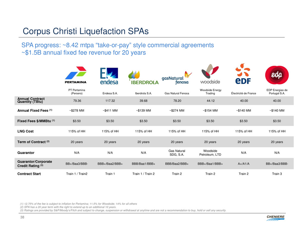 Corpus Christi Liquefaction SPAs 38 PT Pertamina (Persero) Endesa S.A. Iberdrola S.A. Gas Natural Fenosa Woodside Energy Trading Électricité de France EDP Energias de Portugal S.A. Annual Contract Quantity (TBtu) 79.36 117.32 39.68 78.20 44.12 40.00 40.00 Annual Fixed Fees (1) ~$278 MM ~$411 MM ~$139 MM ~$274 MM ~$154 MM ~$140 MM ~$140 MM Fixed Fees $/MMBtu (1) $3.50 $3.50 $3.50 $3.50 $3.50 $3.50 $3.50 LNG Cost 115% of HH 115% of HH 115% of HH 115% of HH 115% of HH 115% of HH 115% of HH Term of Contract (2) 20 years 20 years 20 years 20 years 20 years 20 years 20 years Guarantor N/A N/A N/A Gas NaturalSDG, S.A. Woodside Petroleum, LTD N/A N/A Guarantor/Corporate Credit Rating (3) BB+/Baa3/BBB- BBB+/Baa2/BBB+ BBB/Baa1/BBB+ BBB/Baa2/BBB+ BBB+/Baa1/BBB+ A+/A1/A BB+/Baa3/BBB- Contract Start Train 1 / Train2 Train 1 Train 1 / Train 2 Train 2 Train 2 Train 2 Train 3 SPA progress: ~8.42 mtpa “take-or-pay” style commercial agreements ~$1.5B annual fixed fee revenue for 20 years (1) 12.75% of the fee is subject to inflation for Pertamina; 11.5% for Woodside; 14% for all others (2) SPA has a 20 year term with the right to extend up to an additional 10 years. (3) Ratings are provided by S&P/Moody’s/Fitch and subject to change, suspension or withdrawal at anytime and are not a recommendation to buy, hold or sell any security.