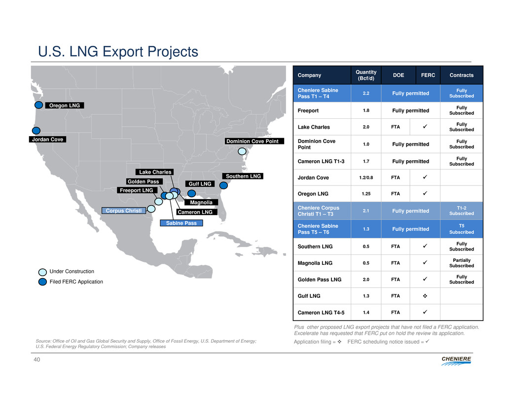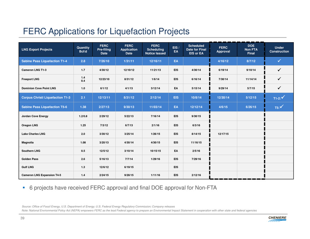 FERC Applications for Liquefaction Projects 6 projects have received FERC approval and final DOE approval for Non-FTA 39 LNG Export Projects Quantity Bcf/d FERC Pre-filing Date FERC Application Date FERC Scheduling Notice Issued EIS / EA Scheduled Date for Final EIS or EA FERC Approval DOE Non FTA Final Under Construction Sabine Pass Liquefaction T1-4 2.8 7/26/10 1/31/11 12/16/11 EA 4/16/12 8/7/12 Cameron LNG T1-3 1.7 4/30/12 12/10/12 11/21/13 EIS 4/30/14 6/19/14 9/10/14 Freeport LNG 1.40.4 12/23/10 8/31/12 1/6/14 EIS 6/16/14 7/30/14 11/14/14 Dominion Cove Point LNG 1.0 6/1/12 4/1/13 3/12/14 EA 5/15/14 9/29/14 5/7/15 Corpus Christi Liquefaction T1-3 2.1 12/13/11 8/31/12 2/12/14 EIS 10/8/14 12/30/14 5/12/15 T1-2: Sabine Pass Liquefaction T5-6 1.38 2/27/13 9/30/13 11/03/14 EA 12/12/14 4/6/15 6/26/15 T5: Jordan Cove Energy 1.2/0.8 2/29/12 5/22/13 7/16/14 EIS 9/30/15 Oregon LNG 1.25 7/3/12 6/7/13 2/1/16 EIS 6/3/16 Lake Charles LNG 2.0 3/30/12 3/25/14 1/26/15 EIS 8/14/15 12/17/15 Magnolia 1.08 3/20/13 4/30/14 4/30/15 EIS 11/16/15 Southern LNG 0.5 12/5/12 3/10/14 10/15/15 EA 2/5/16 Golden Pass 2.6 5/16/13 7/7/14 1/29/16 EIS 7/29/16 Gulf LNG 1.3 12/6/12 6/19/15 EIS Cameron LNG Expansion T4-5 1.4 2/24/15 9/28/15 1/11/16 EIS 2/12/16 Note: National Environmental Policy Act (NEPA) empowers FERC as the lead Federal agency to prepare an Environmental Impact Statement in cooperation with other state and federal agencies Source: Office of Fossil Energy, U.S. Department of Energy; U.S. Federal Energy Regulatory Commission; Company releases
