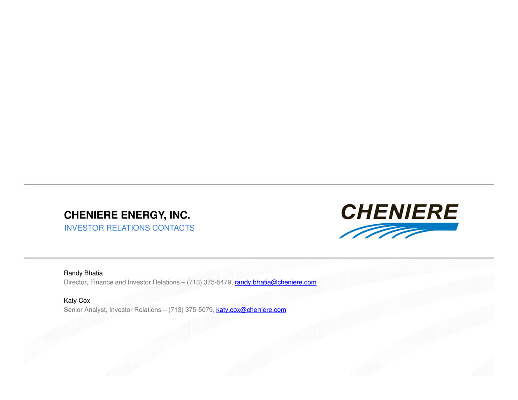 CHENIERE ENERGY, INC. INVESTOR RELATIONS CONTACTS Randy Bhatia Director, Finance and Investor Relations – (713) 375-5479, randy.bhatia@cheniere.com Katy Cox Senior Analyst, Investor Relations – (713) 375-5079, katy.cox@cheniere.com