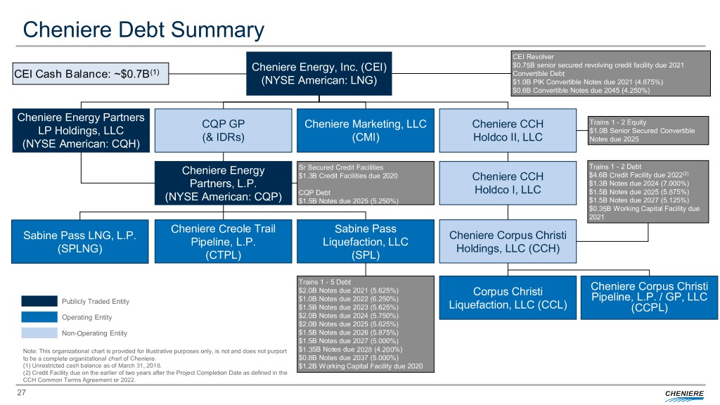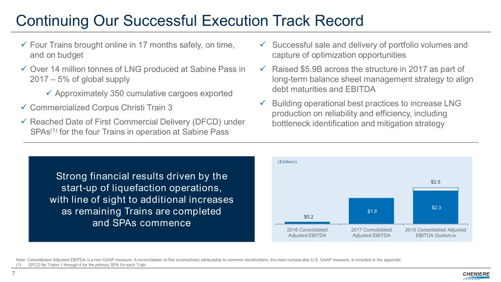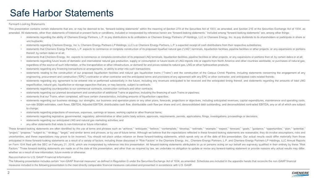 Safe Harbor Statements Forward-Looking Statements This presentation contains certain statements that are, or may be deemed to be, “forward-looking statements” within the meaning of Section 27A of the Securities Act of 1933, as amended, and Section 21E of the Securities Exchange Act of 1934, as amended. All statements, other than statements of historical or present facts or conditions, included or incorporated by reference herein are “forward-looking statements.” Included among “forward-looking statements” are, among other things: • statements regarding the ability of Cheniere Energy Partners, L.P. to pay distributions to its unitholders or Cheniere Energy Partners LP Holdings, LLC or Cheniere Energy, Inc. to pay dividends to its shareholders or participate in share or unit buybacks; • statements regarding Cheniere Energy, Inc.’s, Cheniere Energy Partners LP Holdings, LLC’s or Cheniere Energy Partners, L.P.’s expected receipt of cash distributions from their respective subsidiaries; • statements that Cheniere Energy Partners, L.P. expects to commence or complete construction of its proposed liquefied natural gas (“LNG”) terminals, liquefaction facilities, pipeline facilities or other projects, or any expansions or portions thereof, by certain dates or at all; • statements that Cheniere Energy, Inc. expects to commence or complete construction of its proposed LNG terminals, liquefaction facilities, pipeline facilities or other projects, or any expansions or portions then of, by certain dates or at all; • statements regarding future levels of domestic and international natural gas production, supply or consumption or future levels of LNG imports into or exports from North America and other countries worldwide, or purchases of natural gas, regardless of the source of such information, or the transportation or other infrastructure, or demand for and prices related to natural gas, LNG or other hydrocarbon products; • statements regarding any financing transactions or arrangements, or ability to enter into such transactions; • statements relating to the construction of our proposed liquefaction facilities and natural gas liquefaction trains (“Trains”) and the construction of the Corpus Christi Pipeline, including statements concerning the engagement of any engineering, procurement and construction ("EPC") contractor or other contractor and the anticipated terms and provisions of any agreement with any EPC or other contractor, and anticipated costs related thereto; • statements regarding any agreement to be entered into or performed substantially in the future, including any revenues anticipated to be received and the anticipated timing thereof, and statements regarding the amounts of total LNG regasification, natural gas, liquefaction or storage capacities that are, or may become, subject to contracts; • statements regarding counterparties to our commercial contracts, construction contracts and other contracts; • statements regarding our planned development and construction of additional Trains or pipelines, including the financing of such Trains or pipelines; • statements that our Trains, when completed, will have certain characteristics, including amounts of liquefaction capacities; • statements regarding our business strategy, our strengths, our business and operation plans or any other plans, forecasts, projections or objectives, including anticipated revenues, capital expenditures, maintenance and operating costs, run-rate SG&A estimates, cash flows, EBITDA, Adjusted EBITDA, distributable cash flow, distributable cash flow per share and unit, deconsolidated debt outstanding, and deconsolidated contracted EBITDA, any or all of which are subject to change; • statements regarding projections of revenues, expenses, earnings or losses, working capital or other financial items; • statements regarding legislative, governmental, regulatory, administrative or other public body actions, approvals, requirements, permits, applications, filings, investigations, proceedings or decisions; • statements regarding our anticipated LNG and natural gas marketing activities; and • any other statements that relate to non-historical or future information. These forward-looking statements are often identified by the use of terms and phrases such as “achieve,” “anticipate,” “believe,” “contemplate,” “develop,” “estimate,” “example,” “expect,” “forecast,” “goals,” ”guidance,” “opportunities,” “plan,” “potential,” “project,” “propose,” “subject to,” “strategy,” “target,” and similar terms and phrases, or by use of future tense. Although we believe that the expectations reflected in these forward-looking statements are reasonable, they do involve assumptions, risks and uncertainties, and these expectations may prove to be incorrect. You should not place undue reliance on these forward-looking statements, which speak only as of the date of this presentation. Our actual results could differ materially from those anticipated in these forward-looking statements as a result of a variety of factors, including those discussed in “Risk Factors” in the Cheniere Energy, Inc., Cheniere Energy Partners, L.P. and Cheniere Energy Partners LP Holdings, LLC Annual Reports on Form 10-K filed with the SEC on February 21, 2018, which are incorporated by reference into this presentation. All forward-looking statements attributable to us or persons acting on our behalf are expressly qualified in their entirety by these ”Risk Factors.” These forward-looking statements are made as of the date of this presentation, and other than as required by law, we undertake no obligation to update or revise any forward-looking statement or provide reasons why actual results may differ, whether as a result of new information, future events or otherwise. Reconciliation to U.S. GAAP Financial Information The followin