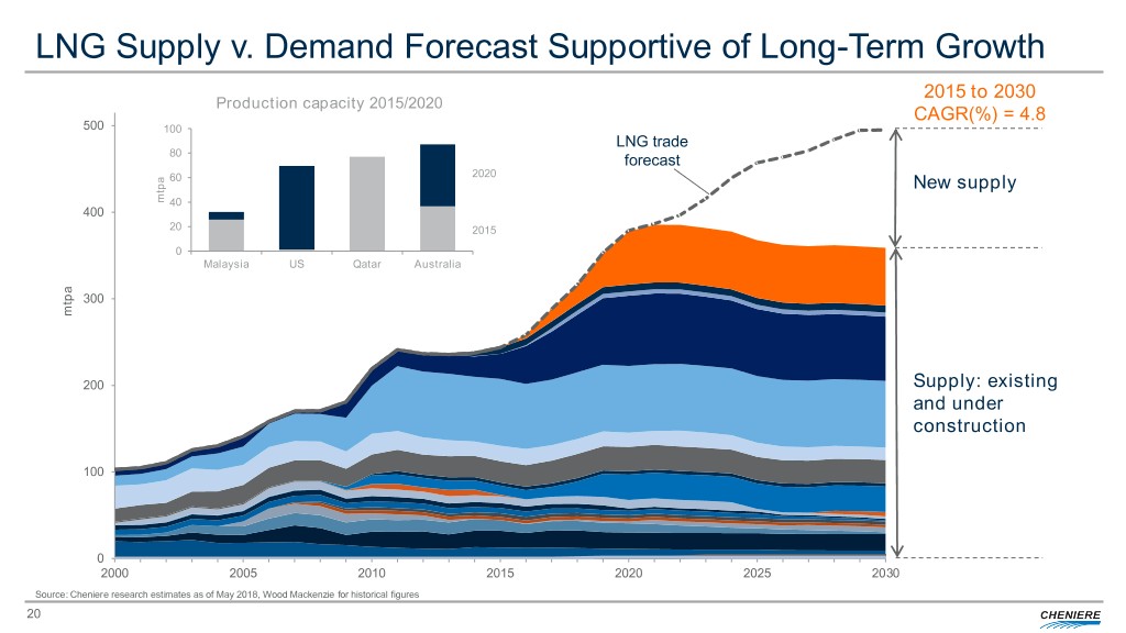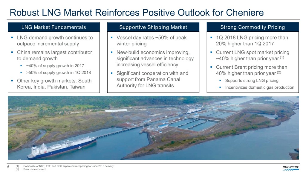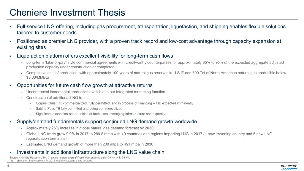 Cheniere Investment Thesis . Full-service LNG offering, including gas procurement, transportation, liquefaction, and shipping enables flexible solutions tailored to customer needs . Positioned as premier LNG provider, with a proven track record and low-cost advantage through capacity expansion at existing sites . Liquefaction platform offers excellent visibility for long-term cash flows • Long-term “take-or-pay” style commercial agreements with creditworthy counterparties for approximately 85% to 95% of the expected aggregate adjusted production capacity under construction or completed • Competitive cost of production, with approximately 100 years of natural gas reserves in U.S.(1) and 800 Tcf of North American natural gas producible below $3.00/MMBtu . Opportunities for future cash flow growth at attractive returns • Uncontracted incremental production available to our integrated marketing function • Construction of additional LNG trains • Corpus Christi T3 commercialized, fully permitted, and in process of financing – FID expected imminently • Sabine Pass T6 fully permitted and being commercialized • Significant expansion opportunities at both sites leveraging infrastructure and expertise . Supply/demand fundamentals support continued LNG demand growth worldwide • Approximately 25% increase in global natural gas demand forecast by 2030 • Global LNG trade grew 9.9% in 2017 to 289.8 mtpa with 40 countries and regions importing LNG in 2017 (1 new importing country and 5 new LNG regasification terminals) • Estimated LNG demand growth of more than 200 mtpa to 491 mtpa in 2030 . Investments in additional infrastructure along the LNG value chain Source: Cheniere Research, EIA, Cheniere interpretation of Wood Mackenzie data (Q1 2018), IHS, GIIGNL (1) Based on EIA’s estimate for 2016 total annual natural gas demand 25
