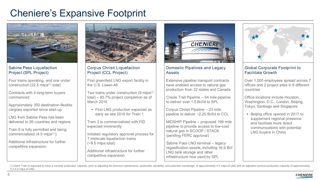 Cheniere Investment Thesis . Full-service LNG offering, including gas procurement, transportation, liquefaction, and shipping enables flexible solutions tailored to customer needs . Positioned as premier LNG provider, with a proven track record and low-cost advantage through capacity expansion at existing sites . Liquefaction platform offers excellent visibility for long-term cash flows • Long-term “take-or-pay” style commercial agreements with creditworthy counterparties for approximately 85% to 95% of the expected aggregate adjusted production capacity under construction or completed • Competitive cost of production, with approximately 100 years of natural gas reserves in U.S.(1) and 800 Tcf of North American natural gas producible below $3.00/MMBtu . Opportunities for future cash flow growth at attractive returns • Uncontracted incremental production available to our integrated marketing function • Construction of additional LNG trains • Corpus Christi T3 commercialized, fully permitted, and in process of financing – FID expected imminently • Sabine Pass T6 fully permitted and being commercialized • Significant expansion opportunities at both sites leveraging infrastructure and expertise . Supply/demand fundamentals support continued LNG demand growth worldwide • Approximately 25% increase in global natural gas demand forecast by 2030 • Global LNG trade grew 9.9% in 2017 to 289.8 mtpa with 40 countries and regions importing LNG in 2017 (1 new importing country and 5 new LNG regasification terminals) • Estimated LNG demand growth of more than 200 mtpa to 491 mtpa in 2030 . Investments in additional infrastructure along the LNG value chain Source: Cheniere Research, EIA, Cheniere interpretation of Wood Mackenzie data (Q1 2018), IHS, GIIGNL (1) Based on EIA’s estimate for 2016 total annual natural gas demand 4