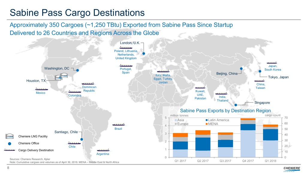 Continuing Our Successful Execution Track Record Four Trains brought online in 17 months safely, on time, Successful sale and delivery of portfolio volumes and and on budget capture of optimization opportunities Over 14 million tonnes of LNG produced at Sabine Pass in Raised $5.9B across the structure in 2017 as part of 2017 – 5% of global supply long-term balance sheet management strategy to align Approximately 350 cumulative cargoes exported debt maturities and EBITDA Commercialized Corpus Christi Train 3 Building operational best practices to increase LNG production on reliability and efficiency, including Reached Date of First Commercial Delivery (DFCD) under bottleneck identification and mitigation strategy SPAs(1) for the four Trains in operation at Sabine Pass ($ billions) Strong financial results driven by the $2.5 start-up of liquefaction operations, with line of sight to additional increases $2.3 as remaining Trains are completed $1.8 $0.2 and SPAs commence 2016 Consolidated 2017 Consolidated 2018 Consolidated Adjusted Adjusted EBITDA Adjusted EBITDA EBITDA Guidance Note: Consolidated Adjusted EBITDA is a non-GAAP measure. A reconciliation to Net income(loss) attributable to common stockholders, the most comparable U.S. GAAP measure, is included in the appendix. (1) DFCD for Trains 1 through 4 for the primary SPA for each Train. 7