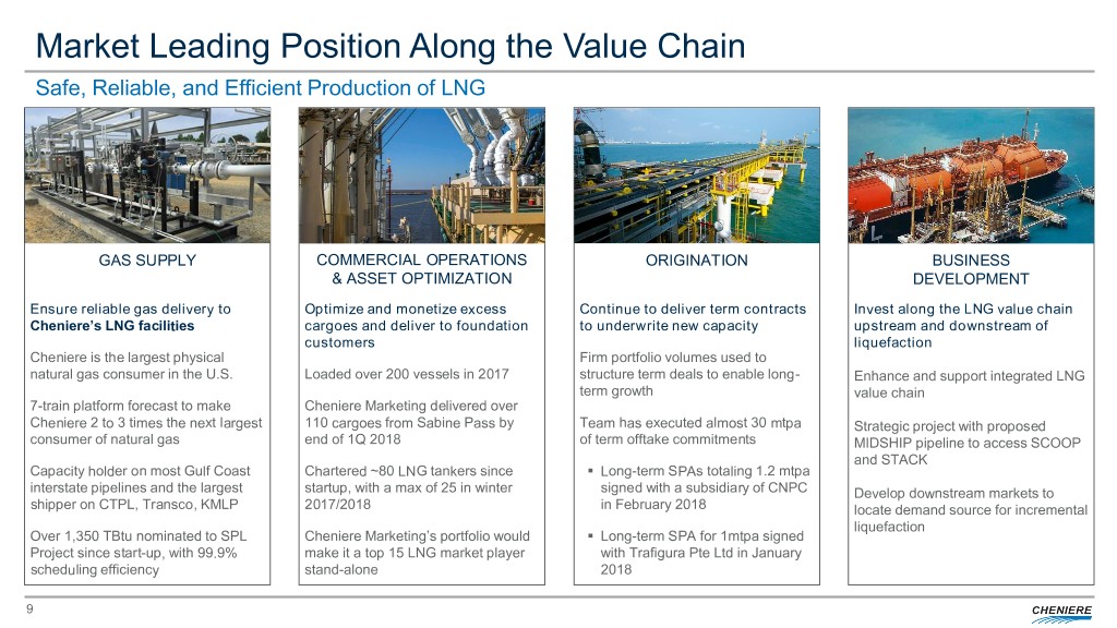 Sabine Pass Cargo Destinations Approximately 350 Cargoes (~1,250 TBtu) Exported from Sabine Pass Since Startup Delivered to 26 Countries and Regions Across the Globe London, U.K. Poland, Lithuania, Netherlands, United Kingdom Japan, Washington, DC Portugal, South Korea Spain Italy, Malta, Beijing, China Egypt, Turkey, Tokyo, Japan Houston, TX Jordan China, Dominican Taiwan Republic Kuwait, Mexico Colombia UAE, Pakistan India, Thailand Singapore Sabine Pass Exports by Destination Region million tonnes cargo count 5 70 Asia Latin America Europe MENA 60 4 Brazil 50 Santiago, Chile 3 40 Cheniere LNG Facility 2 30 Cheniere Office Chile 20 1 Cargo Delivery Destination 10 Argentina 0 0 Sources: Cheniere Research, Kpler Note: Cumulative cargoes and volumes as of April 30, 2018. MENA – Middle East & North Africa Q1 2017 Q2 2017 Q3 2017 Q4 2017 Q1 2018 8