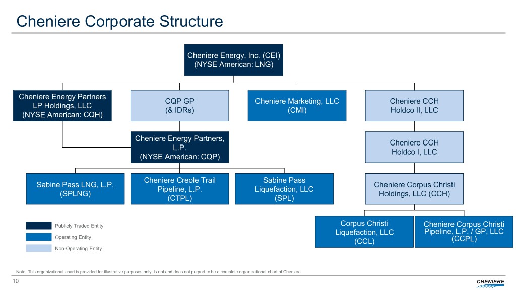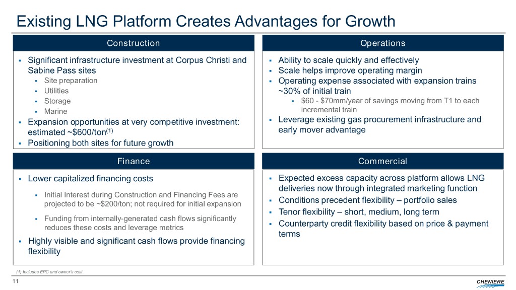 Cheniere Corporate Structure Cheniere Energy, Inc. (CEI) (NYSE American: LNG) Cheniere Energy Partners CQP GP Cheniere Marketing, LLC Cheniere CCH LP Holdings, LLC (& IDRs) (CMI) Holdco II, LLC (NYSE American: CQH) Cheniere Energy Partners, Cheniere CCH L.P. Holdco I, LLC (NYSE American: CQP) Cheniere Creole Trail Sabine Pass Sabine Pass LNG, L.P. Cheniere Corpus Christi Pipeline, L.P. Liquefaction, LLC (SPLNG) Holdings, LLC (CCH) (CTPL) (SPL) Publicly Traded Entity Corpus Christi Cheniere Corpus Christi Liquefaction, LLC Pipeline, L.P. / GP, LLC Operating Entity (CCL) (CCPL) Non-Operating Entity Note: This organizational chart is provided for illustrative purposes only, is not and does not purport to be a complete organizational chart of Cheniere. 10