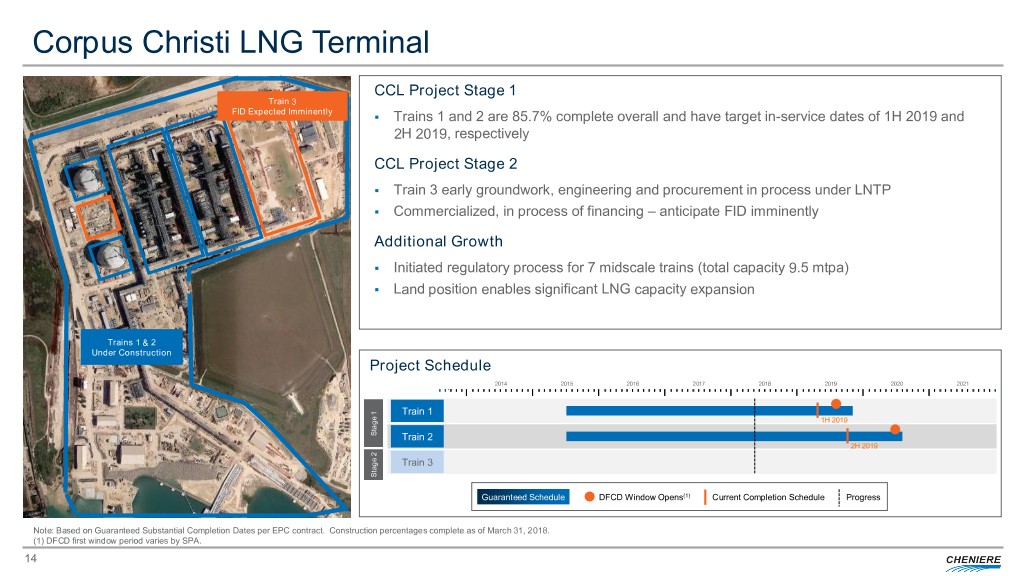 Sabine Pass Liquefaction Project Liquefaction Trains 1-5: Fully Contracted . Trains 1 through 4 are complete and in operation – on budget and ahead of schedule Train 5 . Under Construction Train 5 is 89.3% complete overall and has a target in-service date of 1H 2019 Growth . Train 6 is fully permitted - FID upon obtaining commercial contracts, EPC contract, and financing . Land position enables significant LNG capacity expansion opportunities beyond 6 trains Train 6 Fully Permitted Trains 1 - 4 In Operation Project Schedule … 2014 2015 2016 2017 2018 2019 2020 2021 Train 1 Stage 1 Stage Train 2 Train 3 Existing Operational Facility Stage 2 Stage Train 4 Train 5 Jun 2019 Stage 3 Stage Current Completion Substantial Completion DFCD Guaranteed Schedule DFCD Window Progress Schedule Achieved Achieved Note: Based on Guaranteed Substantial Completion Dates per EPC contract. Construction percentages complete as of March 31, 2018. 13
