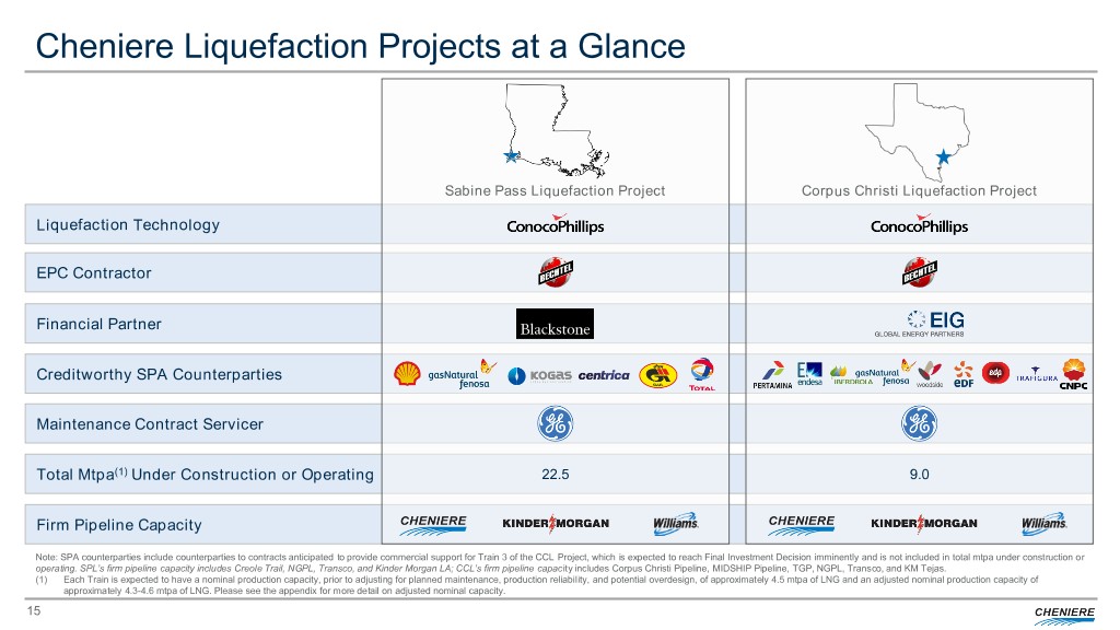 Corpus Christi LNG Terminal CCL Project Stage 1 Train 3 FID Expected Imminently . Trains 1 and 2 are 85.7% complete overall and have target in-service dates of 1H 2019 and 2H 2019, respectively CCL Project Stage 2 . Train 3 early groundwork, engineering and procurement in process under LNTP . Commercialized, in process of financing – anticipate FID imminently Additional Growth . Initiated regulatory process for 7 midscale trains (total capacity 9.5 mtpa) . Land position enables significant LNG capacity expansion Trains 1 & 2 Under Construction Project Schedule … 2014 2015 2016 2017 2018 2019 2020 2021 Train 1 1H 2019 Stage 1 Stage Train 2 2H 2019 Train 3 Stage 2 Stage Guaranteed Schedule DFCD Window Opens(1) Current Completion Schedule Progress Note: Based on Guaranteed Substantial Completion Dates per EPC contract. Construction percentages complete as of March 31, 2018. (1) DFCD first window period varies by SPA. 14