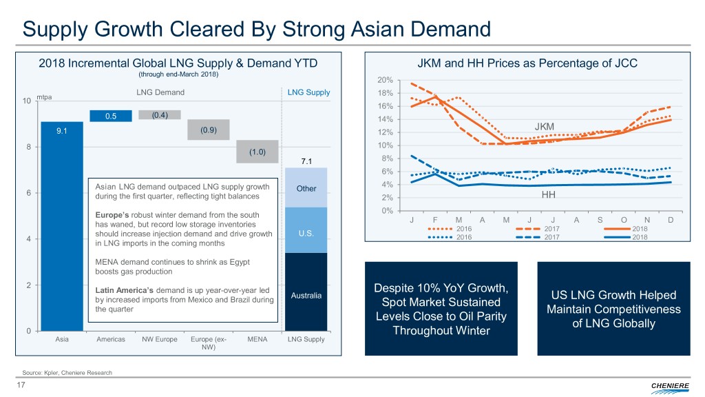 Supply Growth Cleared By Strong Asian Demand 2018 Incremental Global LNG Supply & Demand YTD JKM and HH Prices as Percentage of JCC (through end-March 2018) 20% LNG Demand LNG Supply 18% 10 mtpa 16% (0.4) 0.5 14% JKM 9.1 (0.9) 12% 8 10% (1.0) 7.1 8% 6% 4% Asian LNG demand outpaced LNG supply growth Other 6 during the first quarter, reflecting tight balances 2% HH 0% Europe’s robust winter demand from the south J F M A M J J A S O N D has waned, but record low storage inventories 2016 2017 2018 should increase injection demand and drive growth U.S. 4 2016 2017 2018 in LNG imports in the coming months MENA demand continues to shrink as Egypt boosts gas production 2 Latin America’s demand is up year-over-year led Despite 10% YoY Growth, Australia US LNG Growth Helped by increased imports from Mexico and Brazil during Spot Market Sustained the quarter Maintain Competitiveness Levels Close to Oil Parity of LNG Globally 0 Throughout Winter Asia Americas NW Europe Europe (ex- MENA LNG Supply NW) Source: Kpler, Cheniere Research 17
