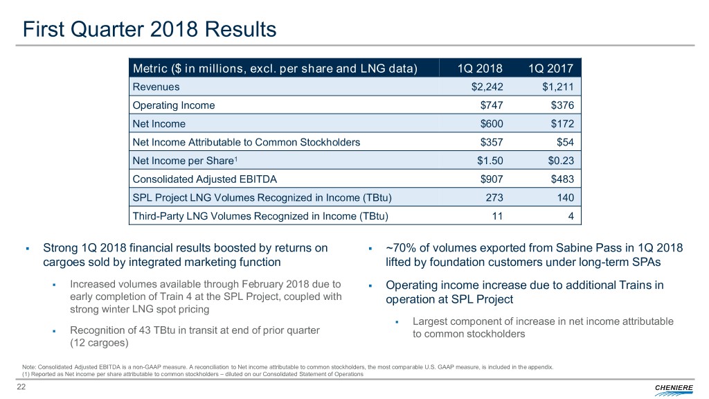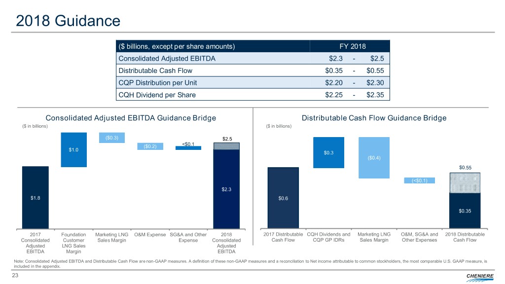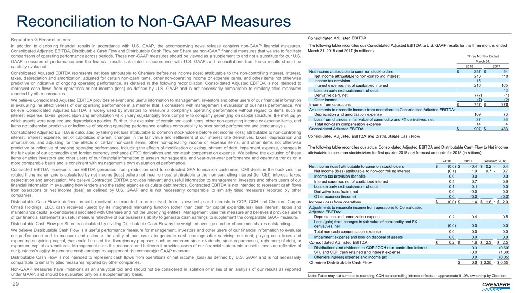 Reconciliation to Non-GAAP Measures Regulation G Reconciliations Consolidated Adjusted EBITDA In addition to disclosing financial results in accordance with U.S. GAAP, the accompanying news release contains non-GAAP financial measures. The following table reconciles our Consolidated Adjusted EBITDA to U.S. GAAP results for the three months ended Consolidated Adjusted EBITDA, Distributable Cash Flow and Distributable Cash Flow per Share are non-GAAP financial measures that we use to facilitate March 31, 2018 and 2017 (in millions): comparisons of operating performance across periods. These non-GAAP measures should be viewed as a supplement to and not a substitute for our U.S. Three Months Ended GAAP measures of performance and the financial results calculated in accordance with U.S. GAAP and reconciliations from these results should be March 31, carefully evaluated. 2018 2017 Consolidated Adjusted EBITDA represents net loss attributable to Cheniere before net income (loss) attributable to the non-controlling interest, interest, Net income attributable to common stockholders $ 357 $ 54 taxes, depreciation and amortization, adjusted for certain non-cash items, other non-operating income or expense items, and other items not otherwise Net income attributable to non-controlling interest 243 118 Income tax provision 15 — predictive or indicative of ongoing operating performance, as detailed in the following reconciliation. Consolidated Adjusted EBITDA is not intended to Interest expense, net of capitalized interest 216 165 represent cash flows from operations or net income (loss) as defined by U.S. GAAP and is not necessarily comparable to similarly titled measures Loss on early extinguishment of debt — 42 reported by other companies. Derivative gain, net (77) (1) We believe Consolidated Adjusted EBITDA provides relevant and useful information to management, investors and other users of our financial information Other income (7) (2) in evaluating the effectiveness of our operating performance in a manner that is consistent with management’s evaluation of business performance. We Income from operations $ 747 $ 376 believe Consolidated Adjusted EBITDA is widely used by investors to measure a company’s operating performance without regard to items such as Adjustments to reconcile income from operations to Consolidated Adjusted EBITDA: interest expense, taxes, depreciation and amortization which vary substantially from company to company depending on capital structure, the method by Depreciation and amortization expense 109 70 which assets were acquired and depreciation policies. Further, the exclusion of certain non-cash items, other non-operating income or expense items, and Loss from changes in fair value of commodity and FX derivatives, net 37 33 items not otherwise predictive or indicative of ongoing operating performance enables comparability to prior period performance and trend analysis. Total non-cash compensation expense 14 4 Consolidated Adjusted EBITDA $ 907 $ 483 Consolidated Adjusted EBITDA is calculated by taking net loss attributable to common stockholders before net income (loss) attributable to non-controlling interest, interest expense, net of capitalized interest, changes in the fair value and settlement of our interest rate derivatives, taxes, depreciation and Consolidated Adjusted EBITDA and Distributable Cash Flow amortization, and adjusting for the effects of certain non-cash items, other non-operating income or expense items, and other items not otherwise predictive or indicative of ongoing operating performance, including the effects of modification or extinguishment of debt, impairment expense, changes in The following table reconciles our actual Consolidated Adjusted EBITDA and Distributable Cash Flow to Net income the fair value of our commodity and foreign currency exchange (“FX”) derivatives and non-cash compensation expense. We believe the exclusion of these attributable to common stockholders for first quarter 2018 and forecast amounts for 2018 (in billions): items enables investors and other users of our financial information to assess our sequential and year-over-year performance and operating trends on a more comparable basis and is consistent with management’s own evaluation of performance. 2016 2017 Revised 2018 Net income (loss) attributable to common stockholders $ (0.6 ) $ (0.4 ) $ 0.2 - 0.4 Contracted EBITDA represents the EBITDA generated from production sold to contracted SPA foundation customers, CMI deals in the book and the Net income (loss) attributable to non-controlling interest (0.1 ) 1.0 0.7 - 0.7 related lifting margin and is calculated by net income (loss) before net income (loss) attributable to the non-controlling interest (for CEI), interest, taxes, Income tax provision (benefit) 0.0 0.0 0.0 depreciation and amortization. We believe Contracted EBITDA provides relevant and useful information to management, investors and others users of our Interest expense, net of capitalized interest 0.5 0.7 0.9 financial information in evaluating how lenders and the rating agencies calculate debt metrics. Contracted EBITDA is not intended to represent cash flows Loss on early extinguishment of debt 0.1 0.1 0.0 from operations or net income (loss) as defined by U.S. GAAP and is not necessarily comparable to similarly titled measures reported by other Derivative loss (gain), net 0.0 (0.0 ) 0.0 companies. Other expense (income) 0.0 (0.0 ) (0.0) Distributable Cash Flow is defined as cash received, or expected to be received, from its ownership and interests in CQP, CQH and Cheniere Corpus Income (loss) from operations $ (0.0 ) $ 1.4 $ 1.8 - $ 2.0 Christi Holdings, LLC, cash received (used) by its integrated marketing function (other than cash for capital expenditures) less interest, taxes and Adjustments to reconcile income from operations to Consolidated maintenance capital expenditures associated with Cheniere and not the underlying entities. Ma