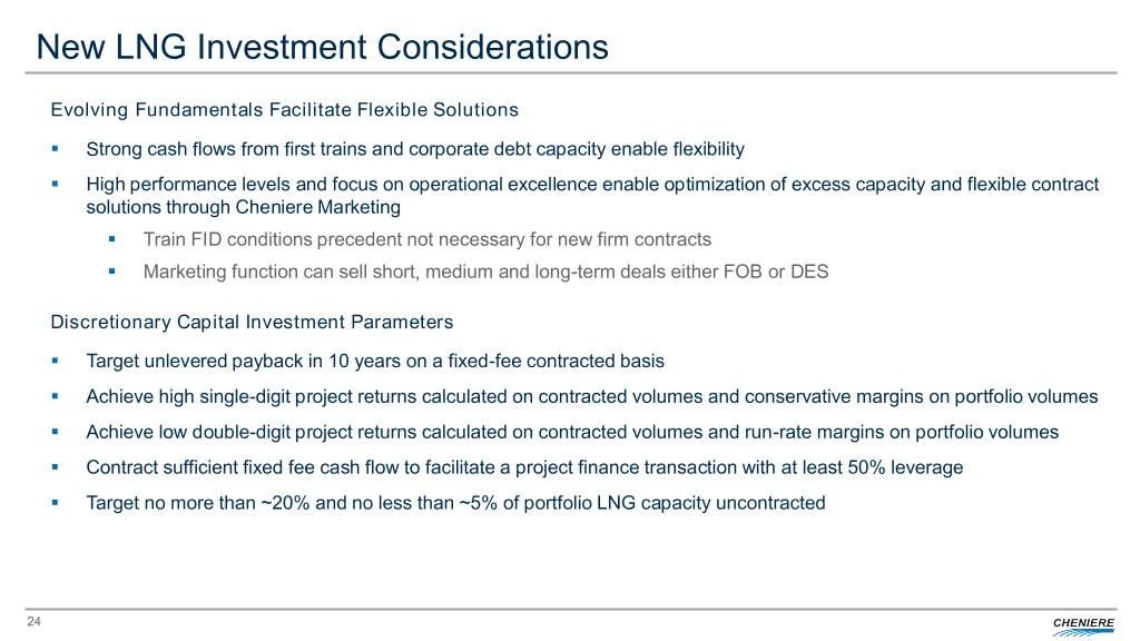 New LNG Investment Considerations Evolving Fundamentals Facilitate Flexible Solutions . Strong cash flows from first trains and corporate debt capacity enable flexibility . High performance levels and focus on operational excellence enable optimization of excess capacity and flexible contract solutions through Cheniere Marketing . Train FID conditions precedent not necessary for new firm contracts . Marketing function can sell short, medium and long-term deals either FOB or DES Discretionary Capital Investment Parameters . Target unlevered payback in 10 years on a fixed-fee contracted basis . Achieve high single-digit project returns calculated on contracted volumes and conservative margins on portfolio volumes . Achieve low double-digit project returns calculated on contracted volumes and run-rate margins on portfolio volumes . Contract sufficient fixed fee cash flow to facilitate a project finance transaction with at least 50% leverage . Target no more than ~20% and no less than ~5% of portfolio LNG capacity uncontracted 24