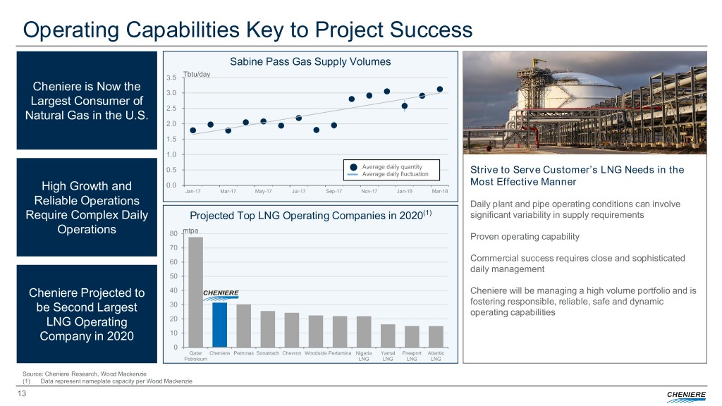 Expected Asian Demand Growth Requires Steady Supply Expansion Cheniere Well Positioned to Satisfy the Call on Reliable, Competitive Supplies of LNG Actual 2017 LNG Trade Growth Forecast LNG Demand Growth, 2017-2030 Emerging Asia, Korea & Taiwan MT 0% 20% 40% 60% 80% 100% 90 80 Philippines Total industry growth 30 Taiwan 70 Korea 60 Bangladesh Asia Emerging 16.35 50 Thailand 40 AsiaAsiaTradional Traditional 7.55 30 Pakistan China 20 All others 6.1 India 10 0 10 20 30 0 MT Source: Cheniere Research, Kpler 12