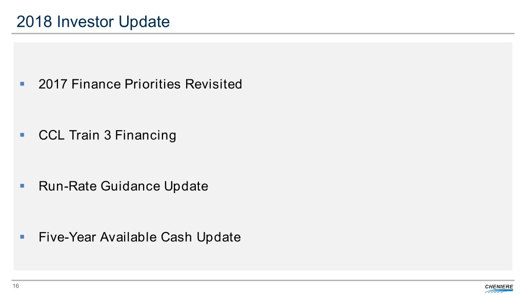 2018 Investor Update . 2017 Finance Priorities Revisited . CCL Train 3 Financing . Run-Rate Guidance Update . Five-Year Available Cash Update 16