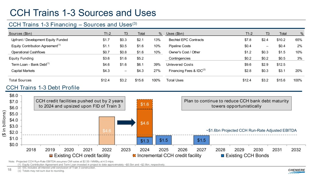 2017 Financial Priorities Revisited Reinvest and return capital while maintaining long term sustainable balance sheet • Recently announced FID of CCL Train 3 financed with approximately 50% debt / 50% equity out earning equity cost of capital and delevering enterprise via re-investment of cash flows • Increased CQP distribution per unit from the minimum quarterly distribution of $1.70 annually to $2.20 annualized • Maintaining fortress liquidity and sustainable leverage priority #1 • Projected returns via share or unit repurchases continue to be benchmark against which capital allocation decisions measured Opportunistically reduce complexity of corporate structure • Recently acquired additional CQH shares from reverse inquiries resulting in pro forma ownership of 91.9% • On May 16, 2018, CEI announced merger proposal to acquire remaining outstanding shares of CQH Ensure fortress liquidity across CEI complex • ~$0.7bn of unrestricted CEI cash as of 3/31/2018 • $750mm CEI revolver in place and undrawn • In process of upsizing CCH (Cheniere Corpus Christi Holdings, LLC) working capital facility from $350mm to $1.2bn Achieve and maintain Investment Grade (“IG”) Ratings at project companies • SPL rated BBB- / Baa3 / BBB- at S&P, Moody’s and Fitch respectively • CCH ratings reaffirmed by S&P and Moody’s for CCL Train 3 FID with path to investment grade in late 2019 / early 2020 Opportunistically term out credit facilities to diversify maturities to better match annual cash flows • Fully termed out SPL credit facilities and $1.5bn at CQP and $4.25bn at CCH; no maturities until 2020 • Reductions in CQP and CCH bank debt maturity towers freed up bank capital to support CCL Train 3 financing • Plan to continue to reduce remaining CQP and CCH bank debt maturity towers opportunistically Evolution of capital structure and successful operational and financial execution have positioned Cheniere to opportunistically reinvest and return capital 17