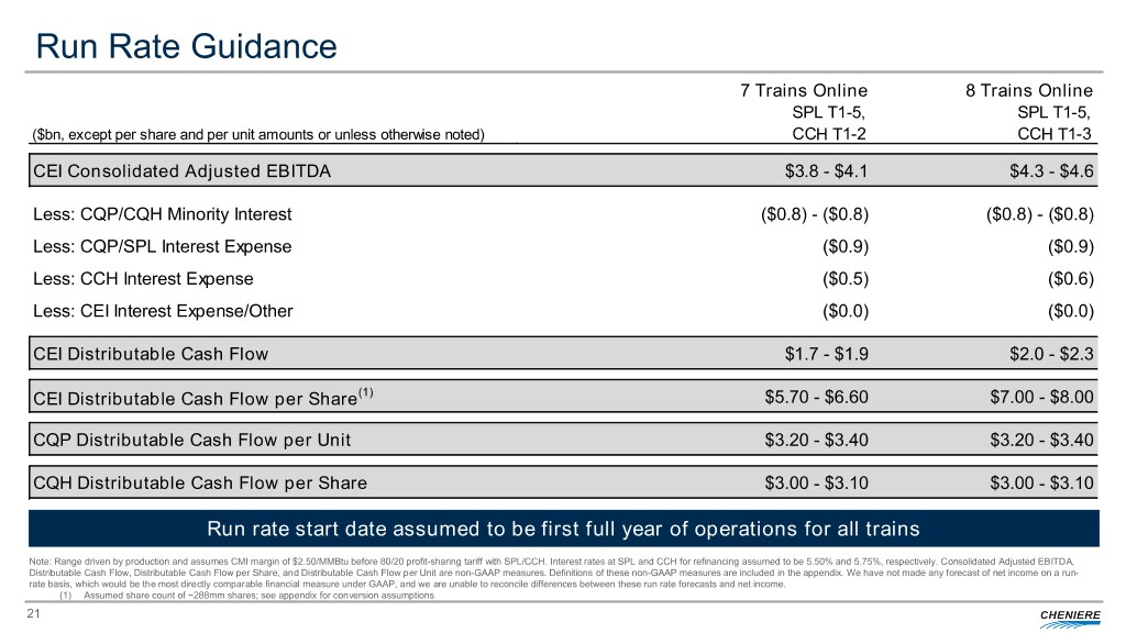 Safe Harbor Statements Forward-Looking Statements This presentation contains certain statements that are, or may be deemed to be, “forward-looking statements” within the meaning of Section 27A of the Securities Act of 1933, as amended, and Section 21E of the Securities Exchange Act of 1934, as amended. All statements, other than statements of historical or present facts or conditions, included or incorporated by reference herein are “forward-looking statements.” Included among “forward-looking statements” are, among other things: • statements regarding the ability of Cheniere Energy Partners, L.P. to pay distributions to its unitholders or Cheniere Energy Partners LP Holdings, LLC or Cheniere Energy, Inc. to pay dividends to its shareholders or participate in share or unit buybacks; • statements regarding Cheniere Energy, Inc.’s, Cheniere Energy Partners LP Holdings, LLC’s or Cheniere Energy Partners, L.P.’s expected receipt of cash distributions from their respective subsidiaries; • statements that Cheniere Energy Partners, L.P. expects to commence or complete construction of its proposed liquefied natural gas (“LNG”) terminals, liquefaction facilities, pipeline facilities or other projects, or any expansions or portions thereof, by certain dates or at all; • statements that Cheniere Energy, Inc. expects to commence or complete construction of its proposed LNG terminals, liquefaction facilities, pipeline facilities or other projects, or any expansions or portions then of, by certain dates or at all; • statements regarding future levels of domestic and international natural gas production, supply or consumption or future levels of LNG imports into or exports from North America and other countries worldwide, or purchases of natural gas, regardless of the source of such information, or the transportation or other infrastructure, or demand for and prices related to natural gas, LNG or other hydrocarbon products; • statements regarding any financing transactions or arrangements, or ability to enter into such transactions; • statements relating to the construction of our proposed liquefaction facilities and natural gas liquefaction trains (“Trains”) and the construction of the Corpus Christi Pipeline, including statements concerning the engagement of any engineering, procurement and construction ("EPC") contractor or other contractor and the anticipated terms and provisions of any agreement with any EPC or other contractor, and anticipated costs related thereto; • statements regarding any agreement to be entered into or performed substantially in the future, including any revenues anticipated to be received and the anticipated timing thereof, and statements regarding the amounts of total LNG regasification, natural gas, liquefaction or storage capacities that are, or may become, subject to contracts; • statements regarding counterparties to our commercial contracts, construction contracts and other contracts; • statements regarding our planned development and construction of additional Trains or pipelines, including the financing of such Trains or pipelines; • statements that our Trains, when completed, will have certain characteristics, including amounts of liquefaction capacities; • statements regarding our business strategy, our strengths, our business and operation plans or any other plans, forecasts, projections or objectives, including anticipated revenues, capital expenditures, maintenance and operating costs, run-rate SG&A estimates, cash flows, EBITDA, Adjusted EBITDA, distributable cash flow, distributable cash flow per share and unit, deconsolidated debt outstanding, and deconsolidated contracted EBITDA, any or all of which are subject to change; • statements regarding projections of revenues, expenses, earnings or losses, working capital or other financial items; • statements regarding legislative, governmental, regulatory, administrative or other public body actions, approvals, requirements, permits, applications, filings, investigations, proceedings or decisions; • statements regarding our anticipated LNG and natural gas marketing activities; and • any other statements that relate to non-historical or future information. These forward-looking statements are often identified by the use of terms and phrases such as “achieve,” “anticipate,” “believe,” “contemplate,” “develop,” “estimate,” “example,” “expect,” “forecast,” “goals,” ”guidance,” “opportunities,” “plan,” “potential,” “project,” “propose,” “subject to,” “strategy,” “target,” and similar terms and phrases, or by use of future tense. Although we believe that the expectations reflected in these forward-looking statements are reasonable, they do involve assumptions, risks and uncertainties, and these expectations may prove to be incorrect. You should not place undue reliance on these forward-looking statements, which speak only as of the date of this presentation. Our actual results could differ materially from those anticipated in these forward-looking statements as a result of a variety of factors, including those discussed in “Risk Factors” in the Cheniere Energy, Inc., Cheniere Energy Partners, L.P. and Cheniere Energy Partners LP Holdings, LLC Annual Reports on Form 10-K filed with the SEC on February 21, 2018, which are incorporated by reference into this presentation. All forward-looking statements attributable to us or persons acting on our behalf are expressly qualified in their entirety by these ”Risk Factors.” These forward-looking statements are made as of the date of this presentation, and other than as required by law, we undertake no obligation to update or revise any forward-looking statement or provide reasons why actual results may differ, whether as a result of new information, future events or otherwise. Reconciliation to U.S. GAAP Financial Information The followin