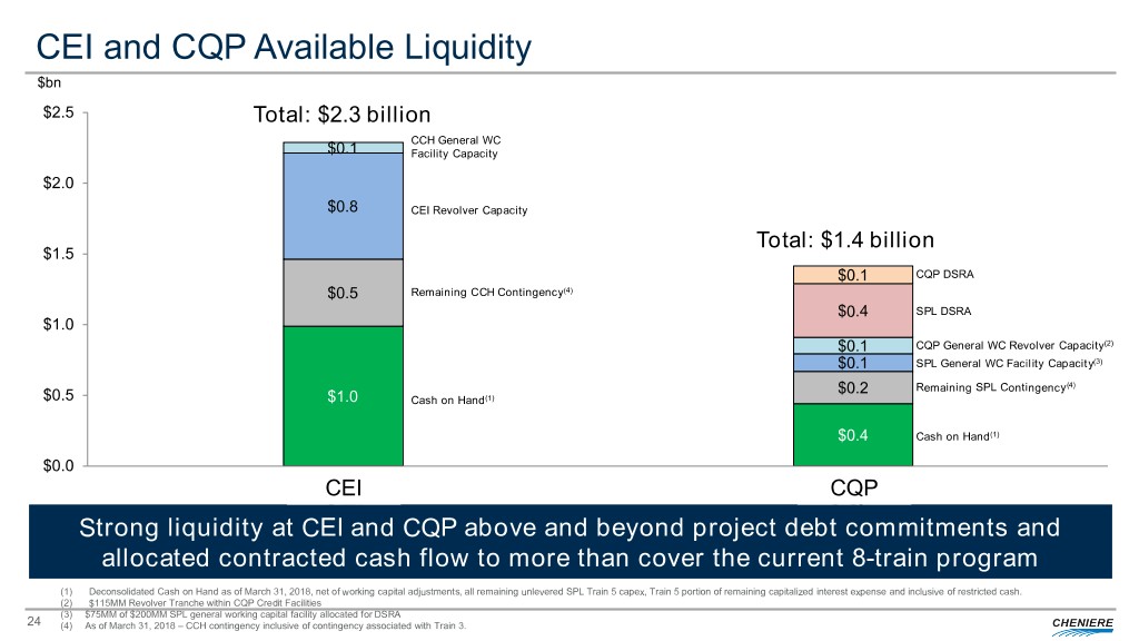 CEI and CQP Available Liquidity $bn $2.5 Total: $2.3 billion CCH General WC $0.1 Facility Capacity $2.0 $0.8 CEI Revolver Capacity Total: $1.4 billion $1.5 $0.1 CQP DSRA $0.5 Remaining CCH Contingency(4) $0.4 SPL DSRA $1.0 $0.1 CQP General WC Revolver Capacity(2) $0.1 SPL General WC Facility Capacity(3) $0.2 Remaining SPL Contingency(4) $0.5 $1.0 Cash on Hand(1) $0.4 Cash on Hand(1) $0.0 CEICEI CQPCQP Strong liquidity at CEI and CQP above and beyond project debt commitments and allocated contracted cash flow to more than cover the current 8-train program (1) Deconsolidated Cash on Hand as of March 31, 2018, net of working capital adjustments, all remaining unlevered SPL Train 5 capex, Train 5 portion of remaining capitalized interest expense and inclusive of restricted cash. (2) $115MM Revolver Tranche within CQP Credit Facilities (3) $75MM of $200MM SPL general working capital facility allocated for DSRA 24 (4) As of March 31, 2018 – CCH contingency inclusive of contingency associated with Train 3.