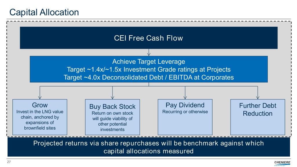 Capital Allocation CEI Free Cash Flow Achieve Target Leverage Target ~1.4x/~1.5x Investment Grade ratings at Projects Target ~4.0x Deconsolidated Debt / EBITDA at Corporates Grow Buy Back Stock Pay Dividend Further Debt Invest in the LNG value Return on own stock Recurring or otherwise Reduction chain, anchored by will guide viability of expansions of other potential brownfield sites investments Projected returns via share repurchases will be benchmark against which capital allocations measured 27