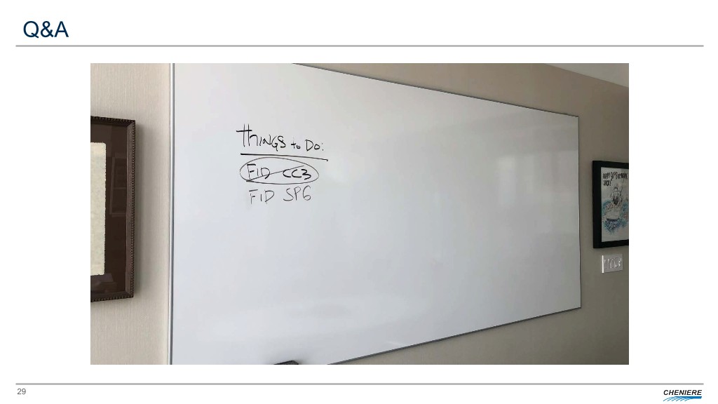 Key Takeaways Cheniere’s first mover advantage and successful financial and operational execution have 1 Cheniere at the forefront of the next wave of new LNG build . FID of CCL Train 3 marks first FID on new U.S. liquefaction capacity since 2015 . Over $1.8bn of Consolidated Adjusted EBITDA in 2017 and over $900mm alone in Q1 2018 . First four trains online ahead of schedule; remaining trains on time and on budget . Two world-class LNG sites with room to grow Long-term balance sheet strategy creates ~10 year run-way to reinvest cash flow to grow and de- 2 lever the business . New trains financed in part with operating cash flow are de-levering balance sheet and pushing out amortization requirements . Project DSCR metrics of 1.4x/1.5x and 4.0x target corporate debt/EBITDA sustainable . No debt maturities until 2020 Robust cash flow generation expected to enable Cheniere to both fund growth and return capital 3 to shareholders . Cheniere generating significant free cash flow: ~$6bn of projected cash available over next five years . Projected returns via share repurchases remain benchmark against capital allocations decisions . Opportunities may arise over time to reduce complexity of corporate structure Cheniere’s significant operational and commercial advantages along with its brownfield siting and financial flexibility enable Cheniere to add substantial LNG capacity over the next five years Note: Consolidated Adjusted EBITDA is a non-GAAP measure. A reconciliation to Net income(loss) attributable to common stockholders, the most comparable U.S. GAAP measure, is included in the appendix. 28