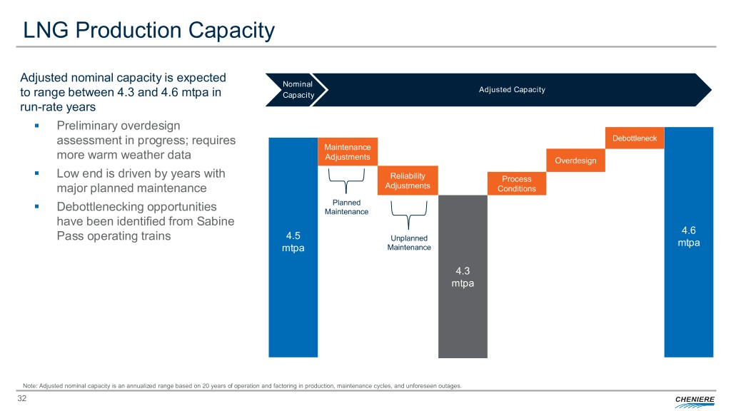 LNG Production Capacity Adjusted nominal capacity is expected Nominal Adjusted Capacity to range between 4.3 and 4.6 mtpa in Capacity run-rate years . Preliminary overdesign assessment in progress; requires Debottleneck Maintenance more warm weather data Adjustments Overdesign . Low end is driven by years with Reliability Process major planned maintenance Adjustments Conditions Planned . Debottlenecking opportunities Maintenance have been identified from Sabine 4.6 Pass operating trains 4.5 Unplanned mtpa mtpa Maintenance 4.3 mtpa Note: Adjusted nominal capacity is an annualized range based on 20 years of operation and factoring in production, maintenance cycles, and unforeseen outages. 32