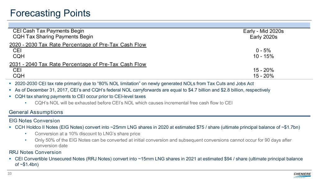 Forecasting Points CEI Cash Tax Payments Begin Early - Mid 2020s CQH Tax Sharing Payments Begin Early 2020s 2020 - 2030 Tax Rate Percentage of Pre-Tax Cash Flow CEI 0 - 5% CQH 10 - 15% 2031 - 2040 Tax Rate Percentage of Pre-Tax Cash Flow CEI 15 - 20% CQH 15 - 20% . 2020-2030 CEI tax rate primarily due to “80% NOL limitation” on newly generated NOLs from Tax Cuts and Jobs Act . As of December 31, 2017, CEI’s and CQH’s federal NOL carryforwards are equal to $4.7 billion and $2.8 billion, respectively . CQH tax sharing payments to CEI occur prior to CEI-level taxes • CQH’s NOL will be exhausted before CEI’s NOL which causes incremental free cash flow to CEI General Assumptions EIG Notes Conversion . CCH Holdco II Notes (EIG Notes) convert into ~25mm LNG shares in 2020 at estimated $75 / share (ultimate principal balance of ~$1.7bn) • Conversion at a 10% discount to LNG’s share price • Only 50% of the EIG Notes can be converted at initial conversion and subsequent conversions cannot occur for 90 days after conversion date RRJ Notes Conversion . CEI Convertible Unsecured Notes (RRJ Notes) convert into ~15mm LNG shares in 2021 at estimated $94 / share (ultimate principal balance of ~$1.4bn) 33