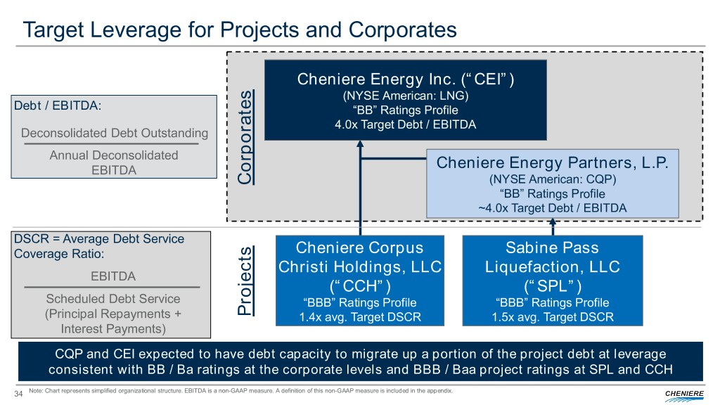 Long-term Capital Structure Plan . Utilize leverage capacity at CQP and CEI (the corporate levels) to delever SPL and CCH (the project levels) over the next 5-10 years . Debt incurrence test will force the deleveraging of SPL and CCH over time at 1.5x/1.4x DSCR . By migrating project debt up to CQP and CEI (subject to target ~4.0x decon. debt / EBITDA constraint), project level debt amortization requirements can be pushed out to the mid to late 2020s . Plan maximizes value to equity holders while adhering to indenture amortization requirements at the project levels . Investment grade ratings at the project levels and strong high yield (“HY”) ratings (BB / Ba) at the corporate levels can be achieved and maintained . This framework provides CEI significant free cash flow to invest and grow which can further defer substantial debt pay down, while at the same time returning capital to shareholders via share repurchases and/or dividends By taking advantage of leverage capacity at the corporate levels, project level debt amortization not required until the mid to late 2020s, even with no growth beyond 8 trains 35