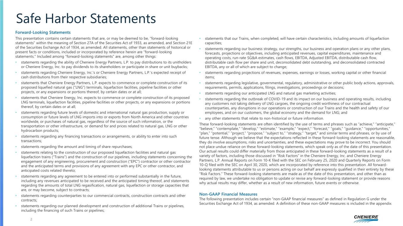 Safe Harbor Statements Forward-Looking Statements This presentation contains certain statements that are, or may be deemed to be, “forward-looking • statements that our Trains, when completed, will have certain characteristics, including amounts of liquefaction statements” within the meaning of Section 27A of the Securities Act of 1933, as amended, and Section 21E capacities; of the Securities Exchange Act of 1934, as amended. All statements, other than statements of historical or • statements regarding our business strategy, our strengths, our business and operation plans or any other plans, present facts or conditions, included or incorporated by reference herein are “forward-looking forecasts, projections or objectives, including anticipated revenues, capital expenditures, maintenance and statements.” Included among “forward-looking statements” are, among other things: operating costs, run-rate SG&A estimates, cash flows, EBITDA, Adjusted EBITDA, distributable cash flow, • statements regarding the ability of Cheniere Energy Partners, L.P. to pay distributions to its unitholders distributable cash flow per share and unit, deconsolidated debt outstanding, and deconsolidated contracted or Cheniere Energy, Inc. to pay dividends to its shareholders or participate in share or unit buybacks; EBITDA, any or all of which are subject to change; • statements regarding Cheniere Energy, Inc.’s or Cheniere Energy Partners, L.P.’s expected receipt of • statements regarding projections of revenues, expenses, earnings or losses, working capital or other financial cash distributions from their respective subsidiaries; items; • statements that Cheniere Energy Partners, L.P. expects to commence or complete construction of its • statements regarding legislative, governmental, regulatory, administrative or other public body actions, approvals, proposed liquefied natural gas (“LNG”) terminals, liquefaction facilities, pipeline facilities or other requirements, permits, applications, filings, investigations, proceedings or decisions; projects, or any expansions or portions thereof, by certain dates or at all; • statements regarding our anticipated LNG and natural gas marketing activities; • statements that Cheniere Energy, Inc. expects to commence or complete construction of its proposed • statements regarding the outbreak of COVID-19 and its impact on our business and operating results, including LNG terminals, liquefaction facilities, pipeline facilities or other projects, or any expansions or portions any customers not taking delivery of LNG cargoes, the ongoing credit worthiness of our contractual thereof, by certain dates or at all; counterparties, any disruptions in our operations or construction of our Trains and the health and safety of our • statements regarding future levels of domestic and international natural gas production, supply or employees, and on our customers, the global economy and the demand for LNG; and consumption or future levels of LNG imports into or exports from North America and other countries • any other statements that relate to non-historical or future information. worldwide, or purchases of natural gas, regardless of the source of such information, or the These forward-looking statements are often identified by the use of terms and phrases such as “achieve,” “anticipate,” transportation or other infrastructure, or demand for and prices related to natural gas, LNG or other “believe,” “contemplate,” “develop,” “estimate,” “example,” “expect,” “forecast,” “goals,” ”guidance,” “opportunities,” hydrocarbon products; “plan,” “potential,” “project,” “propose,” “subject to,” “strategy,” “target,” and similar terms and phrases, or by use of • statements regarding any financing transactions or arrangements, or ability to enter into such future tense. Although we believe that the expectations reflected in these forward-looking statements are reasonable, transactions; they do involve assumptions, risks and uncertainties, and these expectations may prove to be incorrect. You should • statements regarding the amount and timing of share repurchases; not place undue reliance on these forward-looking statements, which speak only as of the date of this presentation. • statements relating to the construction of our proposed liquefaction facilities and natural gas Our actual results could differ materially from those anticipated in these forward-looking statements as a result of a liquefaction trains (“Trains”) and the construction of our pipelines, including statements concerning the variety of factors, including those discussed in “Risk Factors” in the Cheniere Energy, Inc. and Cheniere Energy engagement of any engineering, procurement and construction ("EPC") contractor or other contractor Partners, L.P. Annual Reports on Form 10-K filed with the SEC on February 25, 2020 and Quarterly Reports on Form and the anticipated terms and provisions of any agreement with any EPC or other contractor, and 10-Q filed with the SEC on April 30, 2020, which are incorporated by reference into this presentation. All forward- anticipated costs related thereto; looking statements attributable to us or persons acting on our behalf are expressly qualified in their entirety by these ”Risk Factors.” These forward-looking statements are made as of the date of this presentation, and other than as • statements regarding any agreement to be entered into or performed substantially in the future, required by law, we undertake no obligation to update or revise any forward-looking statement or provide reasons including any revenues anticipated to be received and the anticipated timing thereof, and statements why actual results may differ, whether as a result of new information, future events or otherwise. regarding the amounts of total LNG regasification, natural gas, liquefaction or 