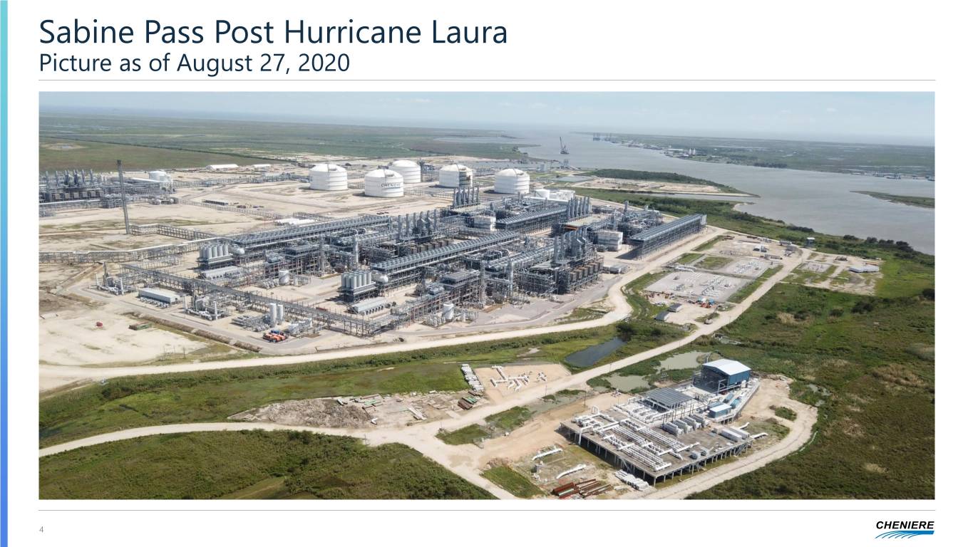 Extraordinary Challenges Reinforce Cheniere’s Resilience and Stability The resilience of our customer-oriented business and the professionalism and resolute focus of the Cheniere workforce continue to deliver outcomes which benefit all of our stakeholders COVID-19 Pandemic Reduced Cargoes Capital Markets Hurricane Laura Prioritizing the health and safety of our Business model operating as designed as Refinanced ~$5B of debt across the All employees safe and no significant workforce while ensuring business customers have exercised right to not lift Cheniere complex while capital markets damage to Sabine Pass continuity some LNG cargoes were under turmoil and the world was working from home Executed hurricane preparedness plan No interruptions to operations at our Reconfirmed FY2020 financial guidance and incident response protocols facilities due to COVID-19 amidst cargo cancellations and market Cost-effectively addressed near-term volatility maturities and higher-cost debt Resumed operations at Sabine Pass ahead Sabine Pass Train 6 completion timeline of plan and with zero safety incidents accelerated to 2H 2022 from 1H 2023 Operated facilities at maximum efficiency Eliminating converts simplifies our with reduced staffing and costs corporate structure and is expected to Meeting all obligations to our foundation Corpus Christi Train 3 commissioning reduce run-rate share count by ~15% and term customers despite downtime ahead of schedule Completed opportunistic maintenance work on all trains, safely and ahead of CCH upgraded to IG by Moody’s schedule 3